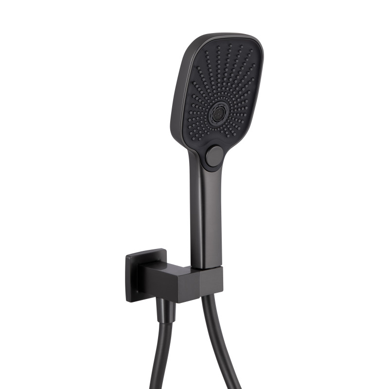 Душова система для душу прихованого монтажу на три споживачі QTGEM114GMB45704 у виконанні Gunmetal Black PVD відрізняється стильним дизайном та високою міцністю. Система включає верхній та ручний душ, що робить її зручним та функціональним рішенням для ванної кімнати. Покриття Gunmetal Black PVD стійке до корозії та зносу, забезпечуючи тривалий термін служби виробу.