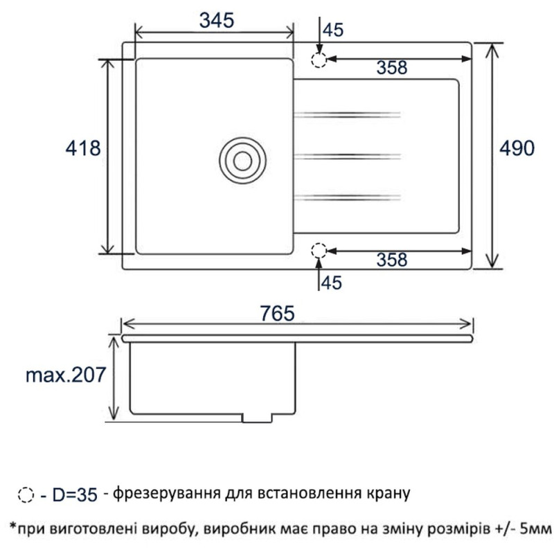| Розмір мийки, мм | 765*485 |