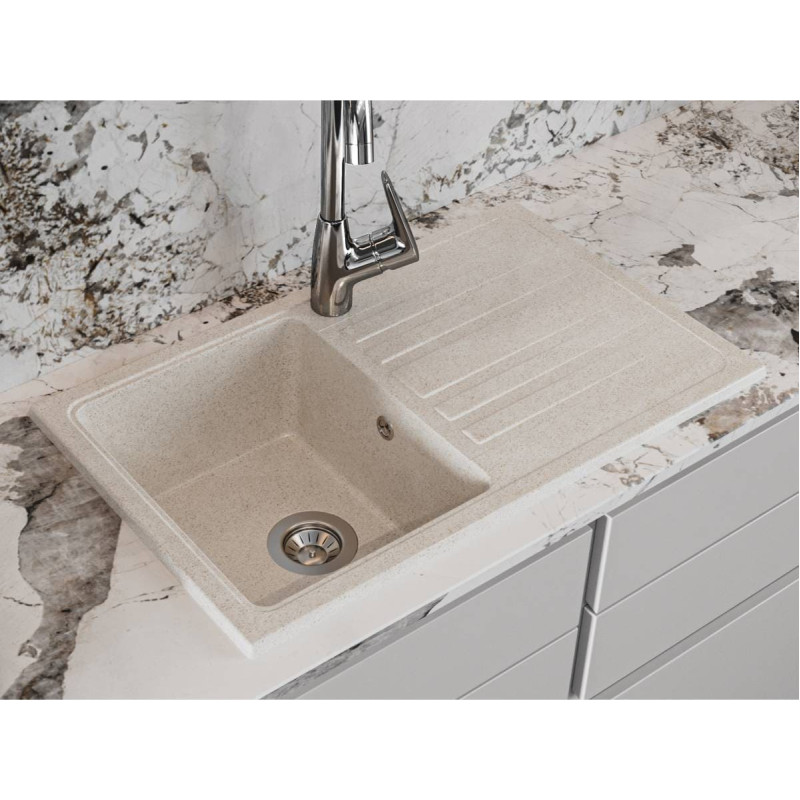 Прямокутна кухонна мийка VERSAL має однорідну текстуру та колір - пісочний. Кількість чаш - 1. Тип установки - врізний. Матеріал мийки - Mirastone - не всочує запахи, відштовхує жир та забруднення, а також не змінює кольору в процесі експлуатації.