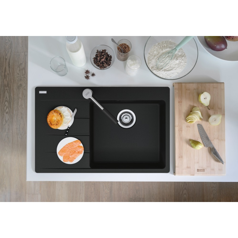 Мийка Centro CNG 611-78 TL 114.0630.466 чорний матовий – це сучасне рішення для кухні, що поєднує стильний вигляд та найвищу якість швейцарського виробника. Виготовлена з інноваційного матеріалу Fragranite, вона вирізняється глибоким матовим чорним кольором, стійкістю до подряпин, високих температур і забруднень.