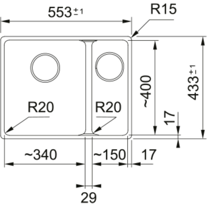 Вбудована мийка Franke з лінійки Maris з великою та маленькою чашею. Виготовлена із Fragranit+, який на 80% складається з натурального граніту. Завдяки використанню дуже дрібних частинок граніту мийка виходить ідеально гладкою та ніжною на дотик. Крім того, мийки Fragranit+ стійкі до подряпин, ударів та плям, а їх колір не змінюється з часом. Також вони стійкі до короткочасного впливу високих температур (до 280°C протягом 15 секунд).