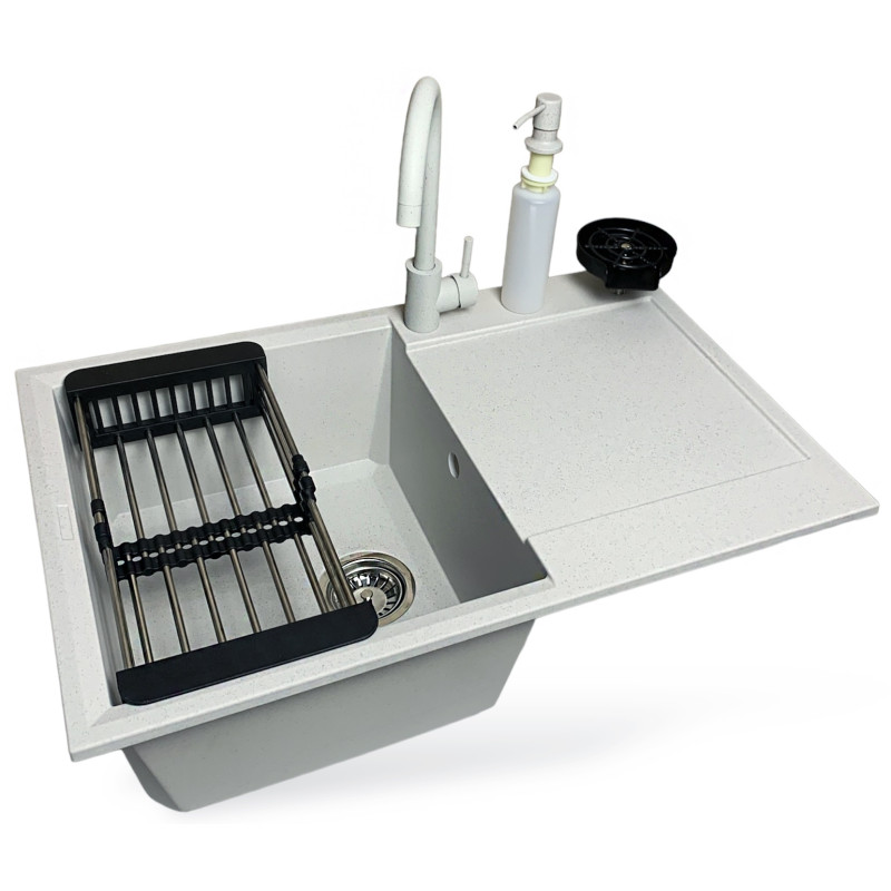 Набір Adamant Horizon поєднує простору мийку зі штучного каменю, змішувач, дозатор, коландер та ополіскувач для склянок, створюючи зручний багатофункціональний комплекс для кухні. Глибока чаша й крило дозволяють комфортно працювати з великим посудом. Матеріал Solid Surface забезпечує високу стійкість до температур і щоденних навантажень. Елементи набору мають захисне покриття для тривалого використання. Це практичне рішення для сучасних кухонних інтер’єрів.