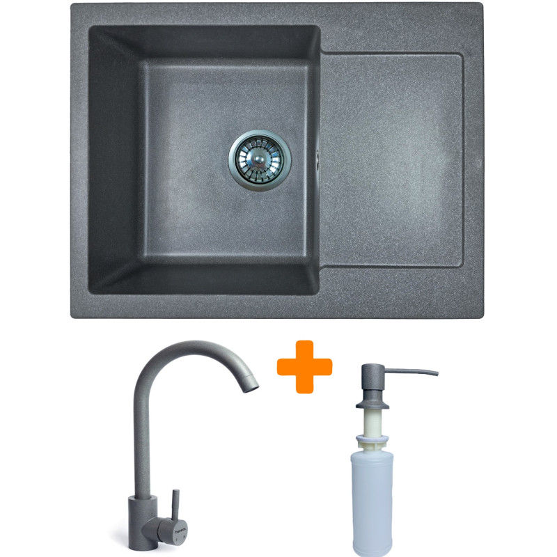 Набір кухонний Adamant Minimal, штучний камінь, прямокут., з крилом, 615х495х200мм, чаша - 1, врізна, сірий + змішувач та дозатор