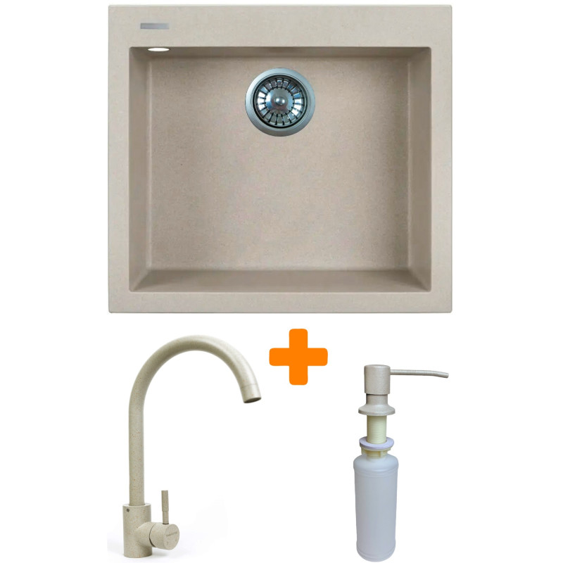 Набір Adamant Univer поєднує квадратну врізну мийку зі штучного каменю, змішувач та дозатор – зручне рішення для продуманої кухні. Технологія Solid Surface забезпечує міцність, термостійкість та простоту догляду. Глибока чаша створює комфорт під час щоденної роботи, а компактна конструкція без крила допомагає раціонально використовувати простір. Дозатор робить подачу мийного засобу акуратною та зручною, підтримуючи порядок у робочій зоні.