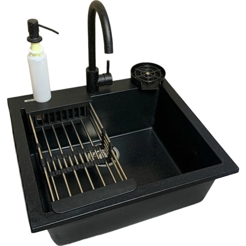 Набір кухонний Adamant Univer, штучний камінь, квадрат, без крила, 560х500х200мм, чаша - 1, врізна, чорний + змішувач + дозатор + ополіскувач склянок + коландер