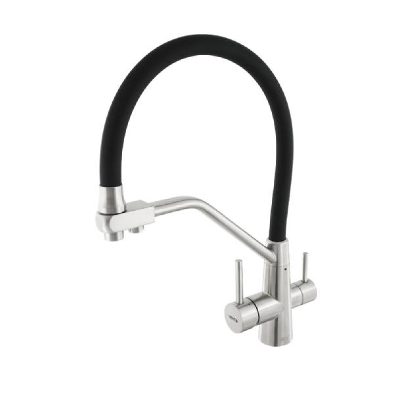 Змішувач для кухні VENTA BK823AB — стильне поєднання контрастних кольорів: сатинового та чорного для підкреслення вишуканості. Двоважільна система управління забезпечує комфортне користування, а унікальна функція підключення до фільтра дозволяє отримувати кришталево чисту питну воду, що є надзвичайно важливим для здоров'я всієї родини.