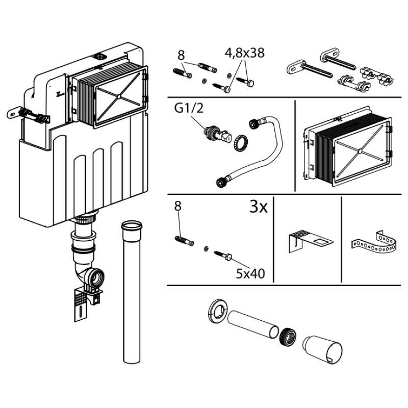 Бачок призначений для окремо стоячих унітазів та чаш Генуя. Конструкція полістирольной ізоляції спрощує процес замуровування в стіну, уникає процесу конденсації на поверхні бачка та послаблює вібрацію в будівельній конструкції. Подвійний змив, який регулюється незалежно, з гігієнічним резервом. Підходить для монтажу пневматичного та сенсорного змиву. Сумісна зі всіма кнопками управління Alcaplast. Бачок виготовлений з одного фрагменту поліпропилена, що забезпечує його 100% герметичність.Підвід води до задньої стінки бачка чи зверху бачка. Можливість сервісу без використання інструментів. Кришка сервісного отвору полегшує монтаж та захищає від вологи та бруду. Монтажна висота - 1062 мм. Монтажна глибина рукава регулюється від 20 до 95 мм. Монтажна глибина -125 мм. Весь санфаянс має сертифікати якості та санітарно-гігієнічні висновки.