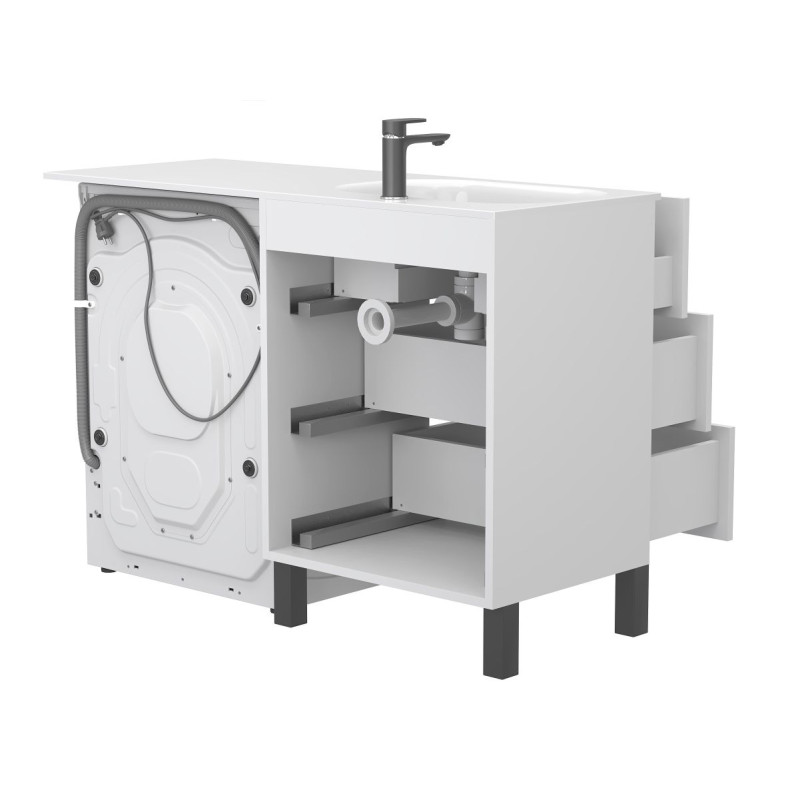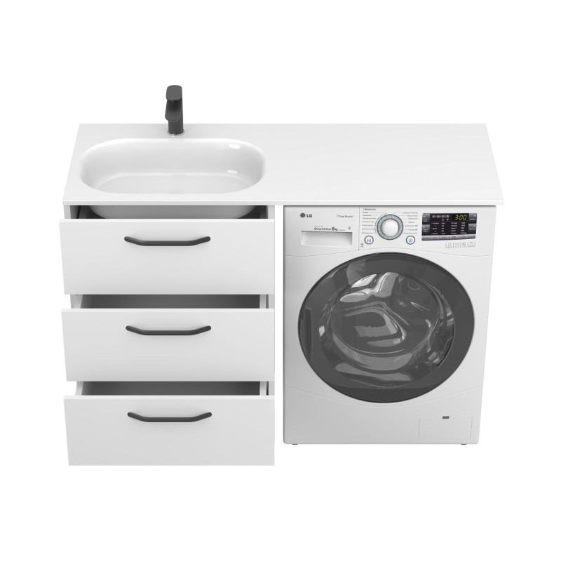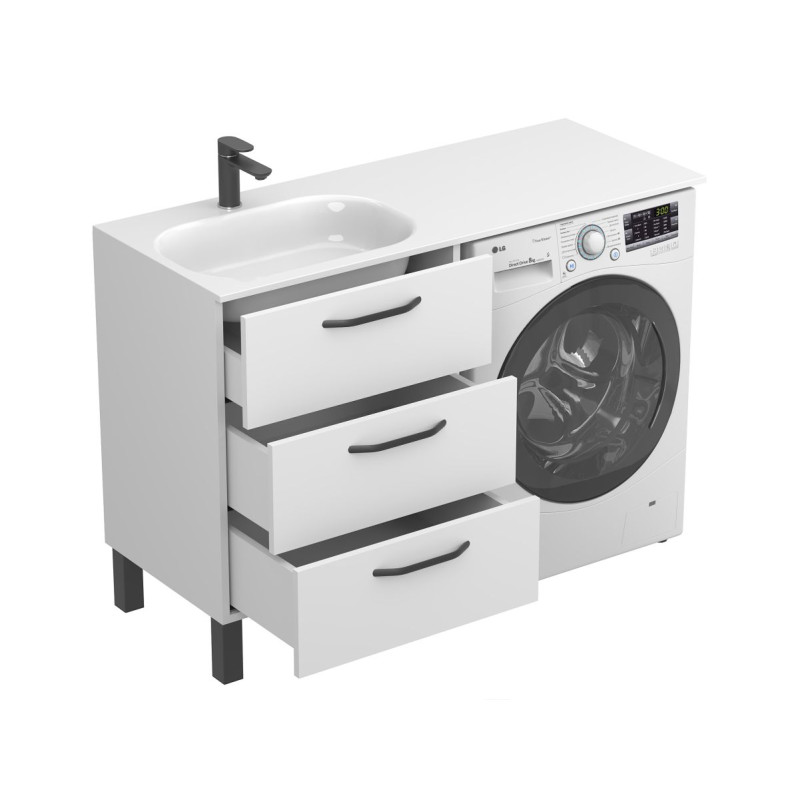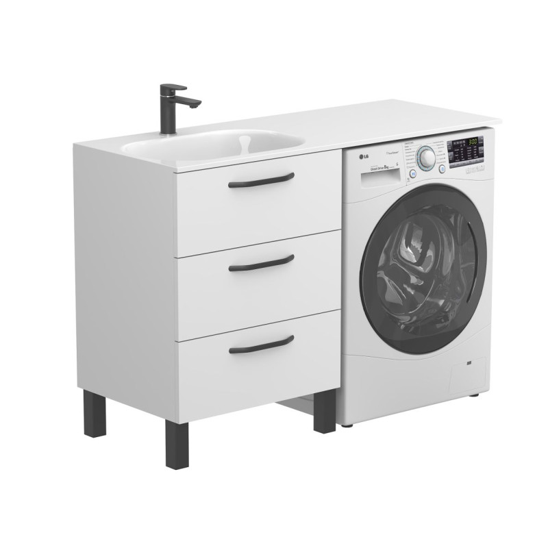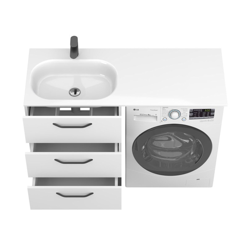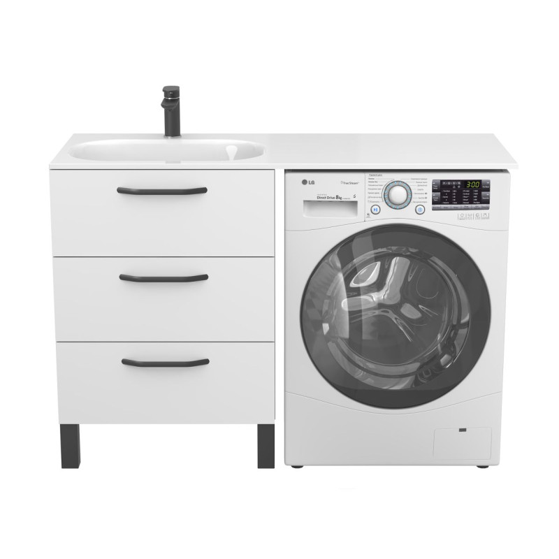 Тумба підлогова TESSA Біла з умивальником LAKE 1250 L від бренду MIRAGGIO — практичне та стильне рішення для ванної кімнати дому, готелю чи апартаментів.