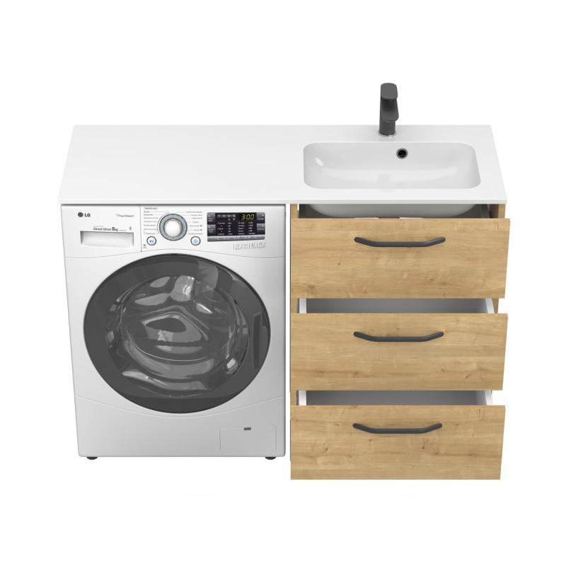 Ширина виробу — 1200 мм робить модель зручною для приміщень різної площі. Спосіб відчинення шухляд у даній моделі тумби - За ручку.