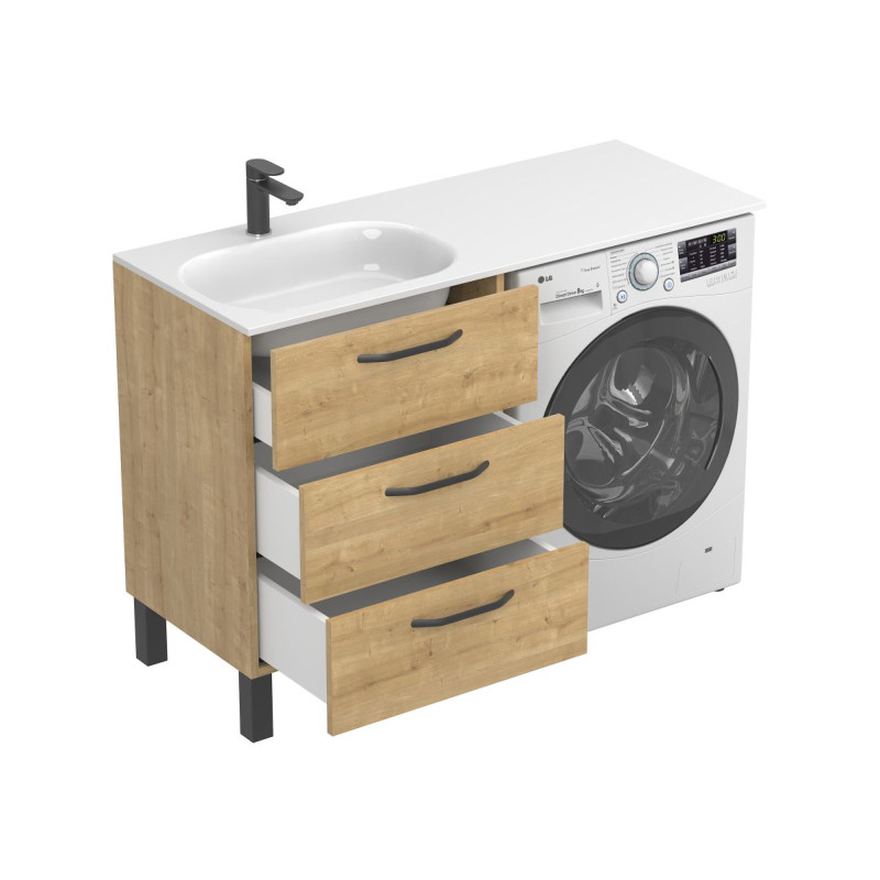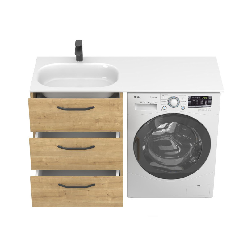 Ширина виробу — 1250 мм робить модель зручною для приміщень різної площі. Спосіб відчинення шухляд у даній моделі тумби - За ручку.