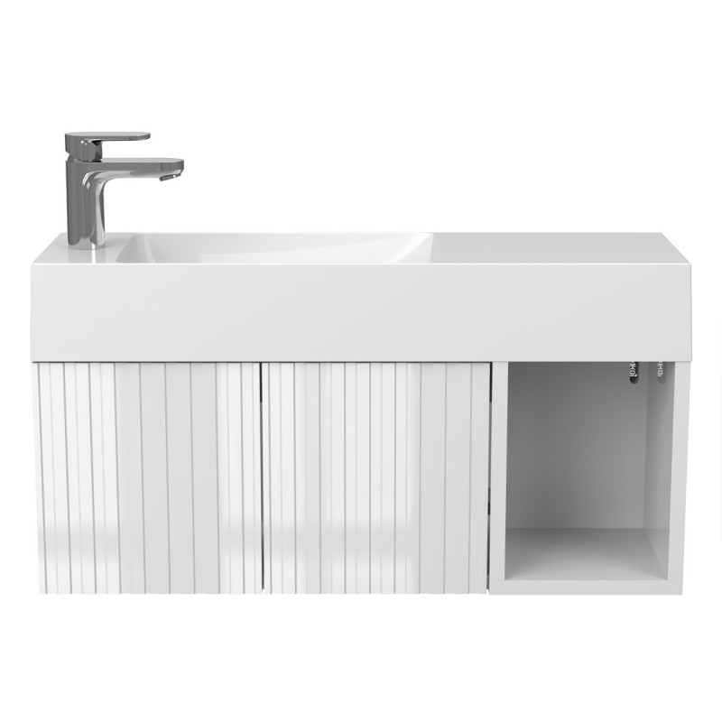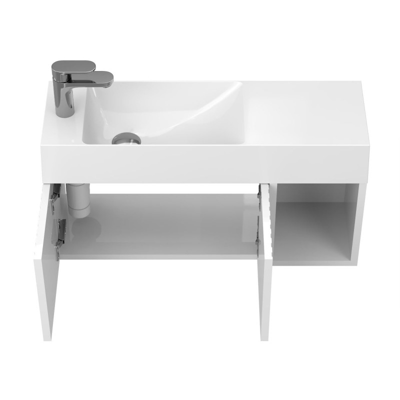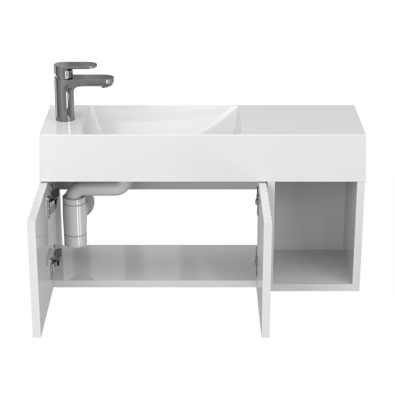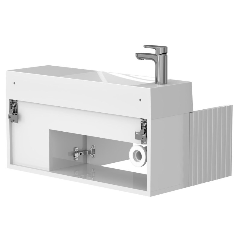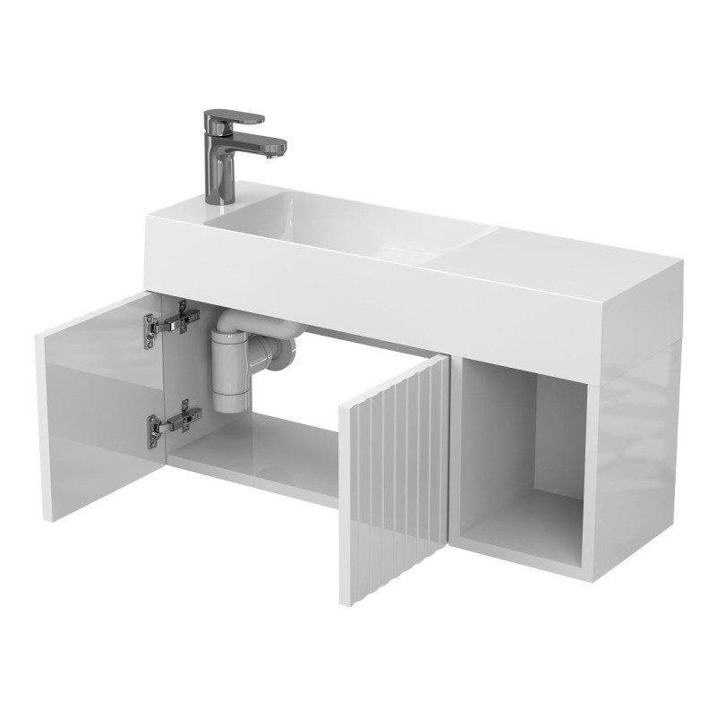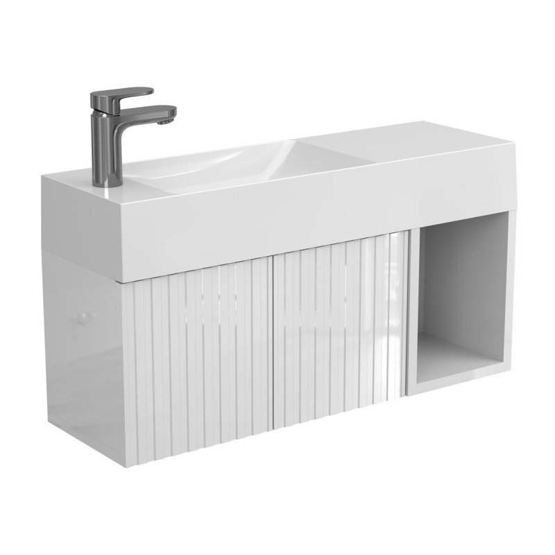 Тумба підвісна AURA біла глянцева з умивальником SHANGHAI L від бренду MIRAGGIO — практичне та стильне рішення для ванної кімнати дому, готелю чи апартаментів.