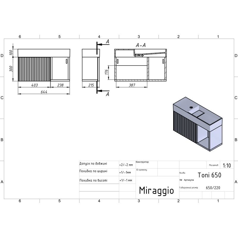 | Комплектація | Умивальник, тумба у зібраному вигляді |