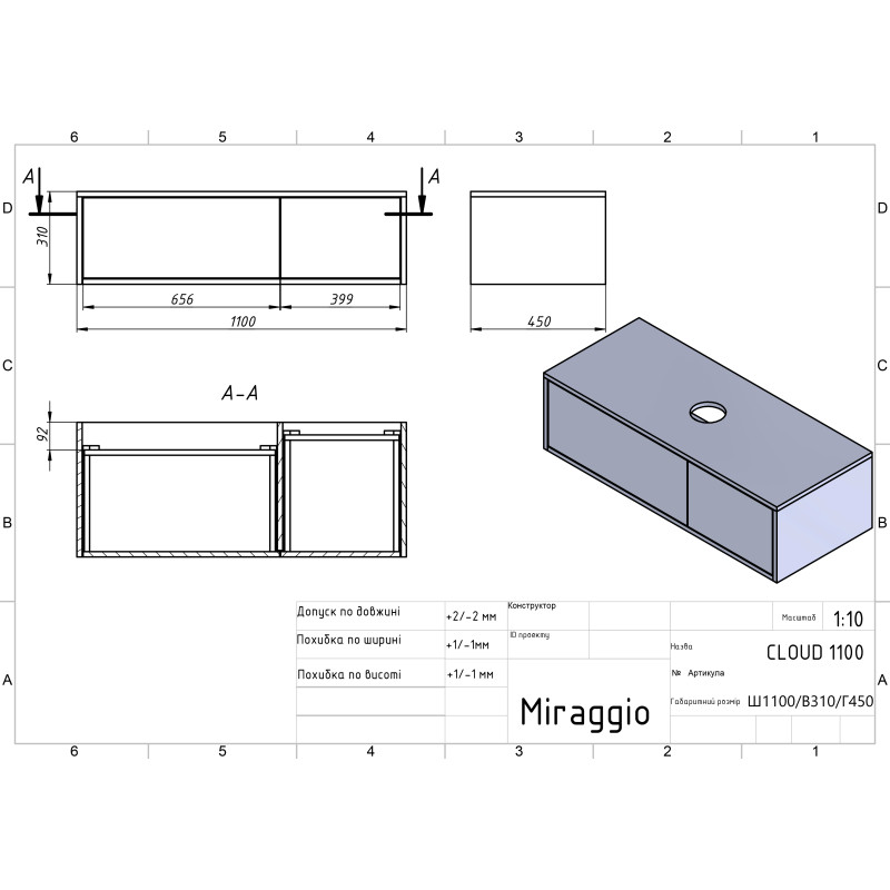 Ширина виробу — 1100 мм робить модель зручною для приміщень різної площі. Спосіб відчинення шухляд у даній моделі тумби - Push-Оpen.