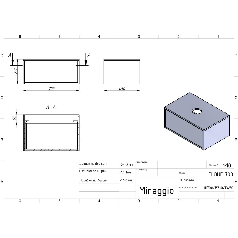 Ширина виробу — 700 мм робить модель зручною для приміщень різної площі. Спосіб відчинення шухляд у даній моделі тумби - Push-Оpen.