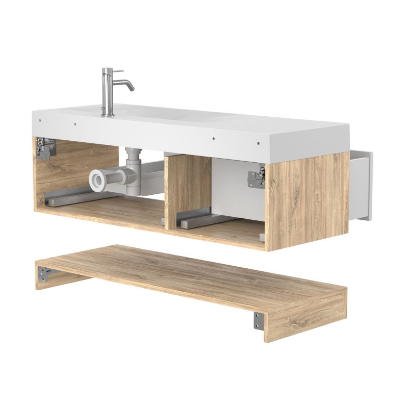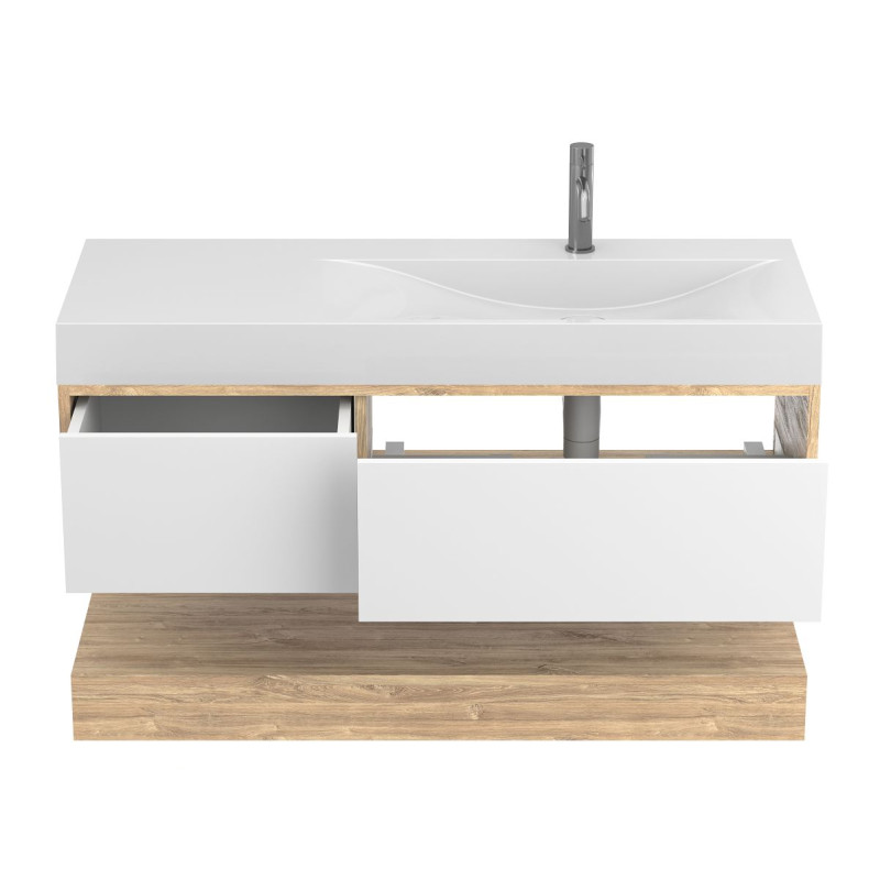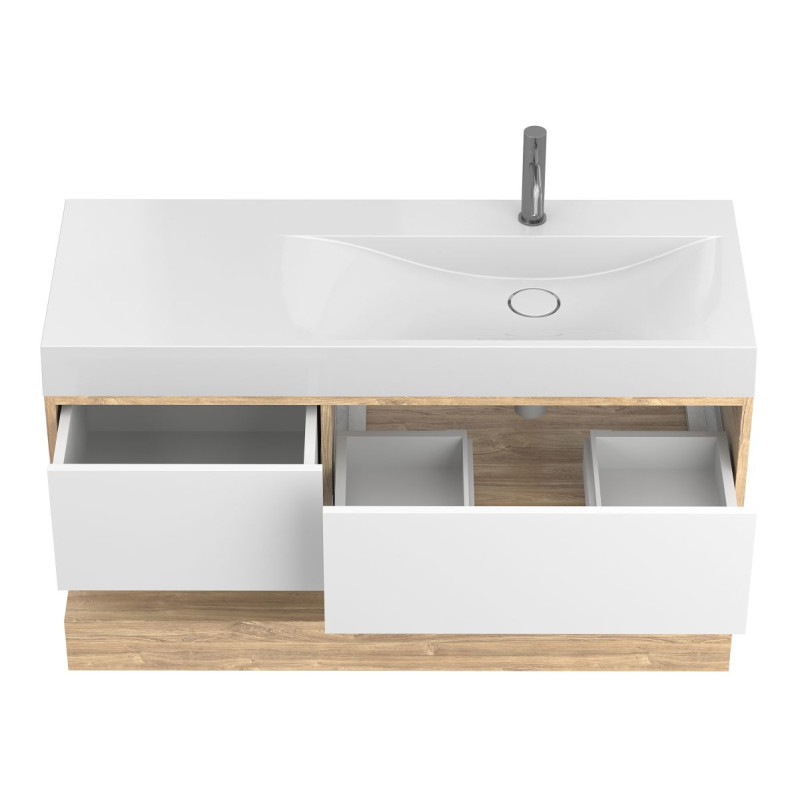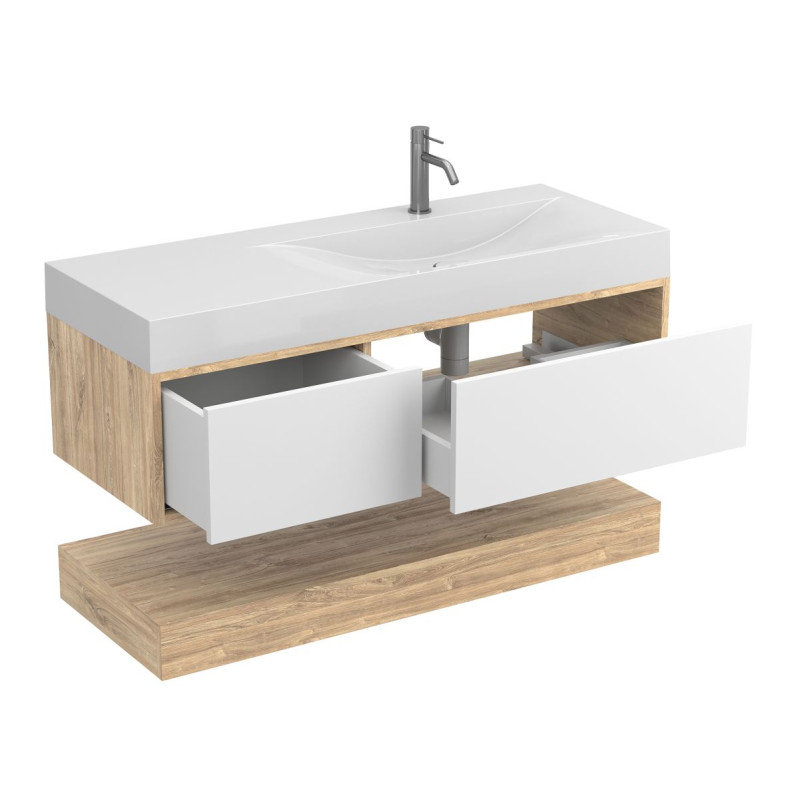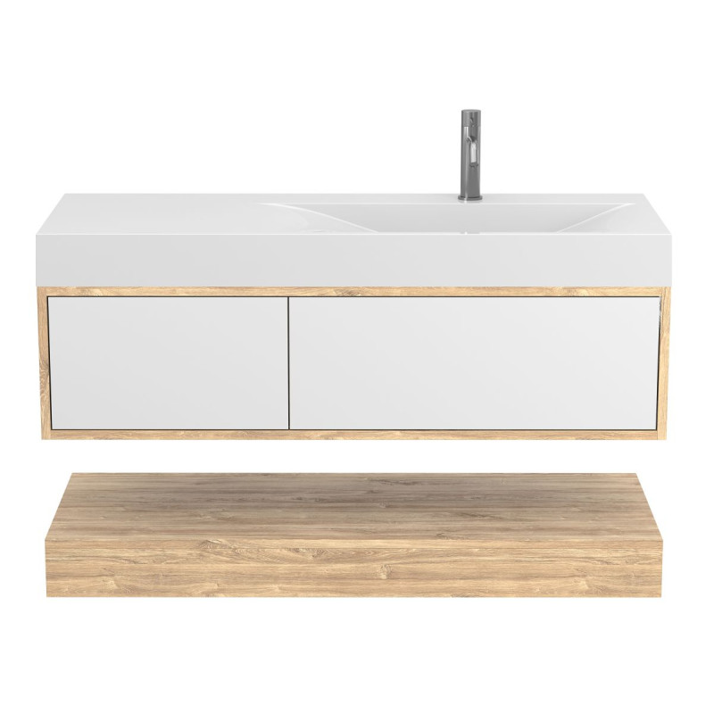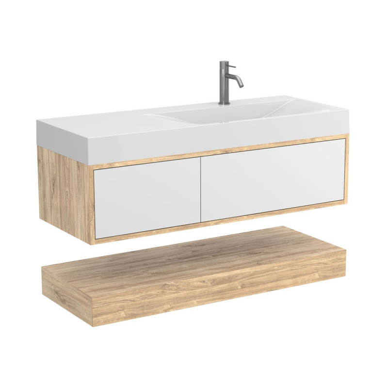 Тумба підвісна DUO Дуб Канзас з умивальником VIOLA 1200 R від бренду MIRAGGIO — практичне та стильне рішення для ванної кімнати дому, готелю чи апартаментів.