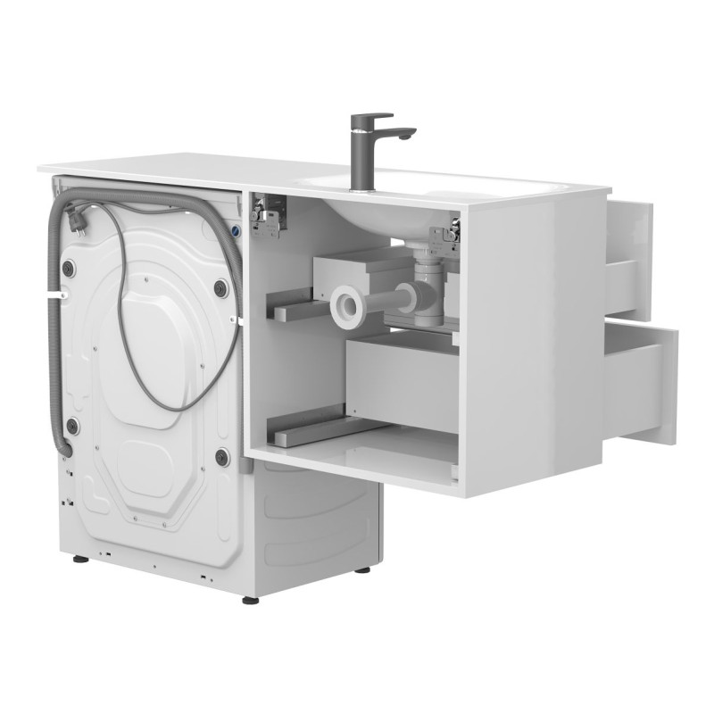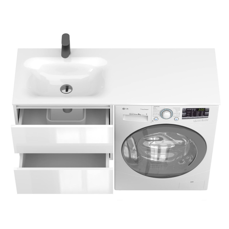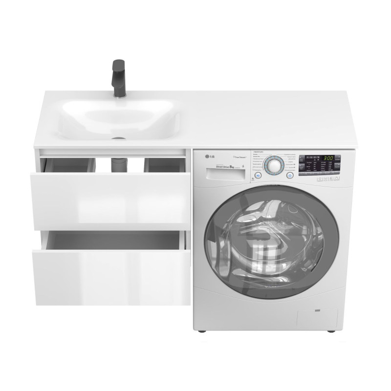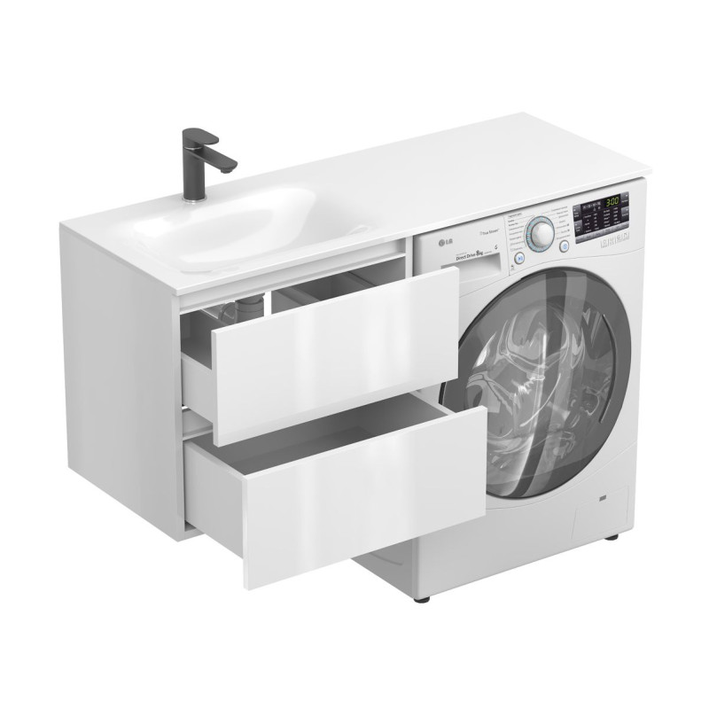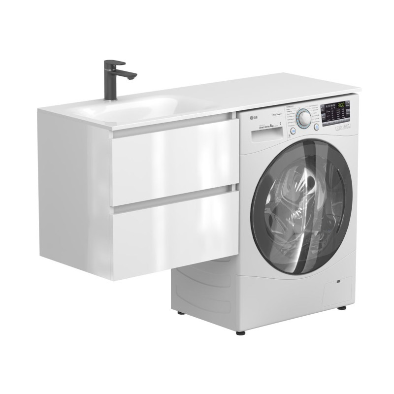 Тумба підвісна LUMO Біла глянцева з умивальником JESSEL 1200 L від бренду MIRAGGIO — практичне та стильне рішення для ванної кімнати дому, готелю чи апартаментів.