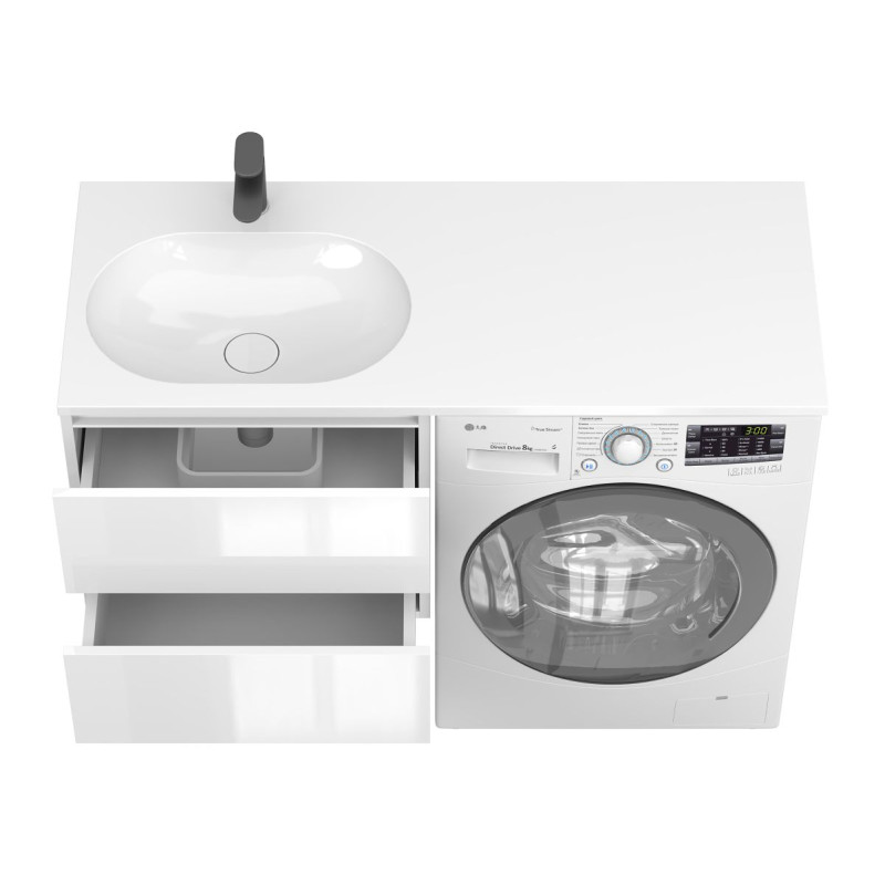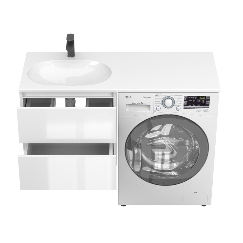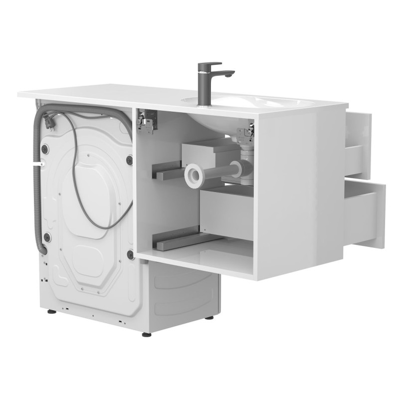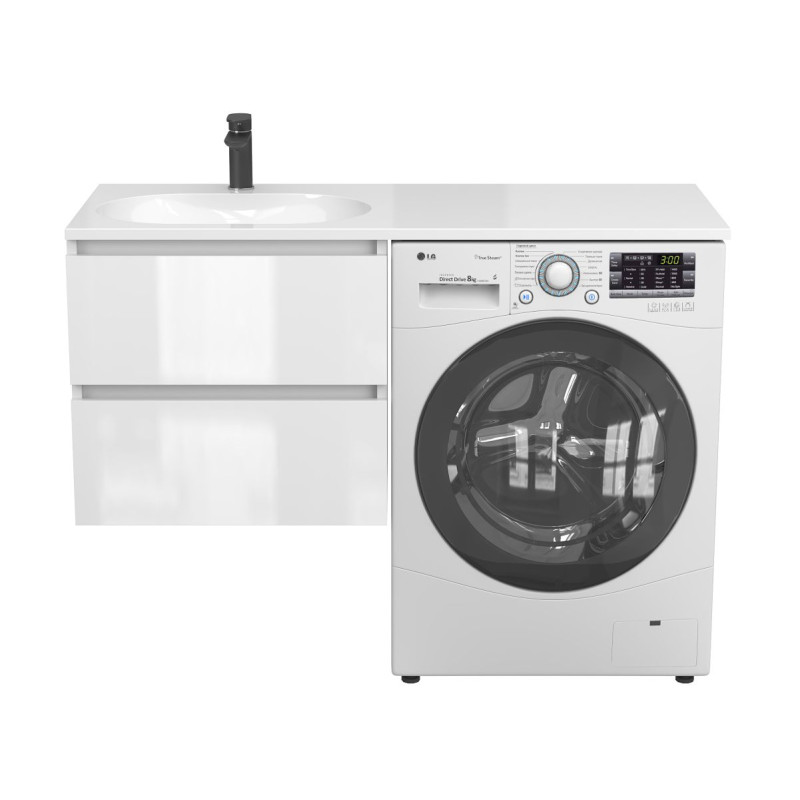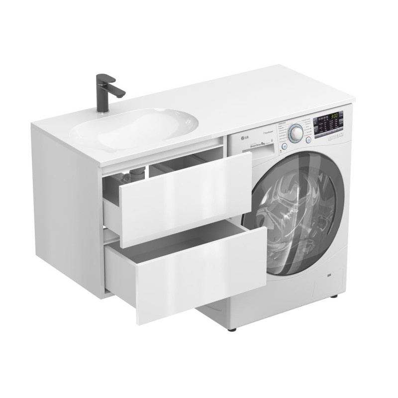 Тумба підвісна LUMO Біла глянцева з умивальником LAKE 1250 L від бренду MIRAGGIO — практичне та стильне рішення для ванної кімнати дому, готелю чи апартаментів.