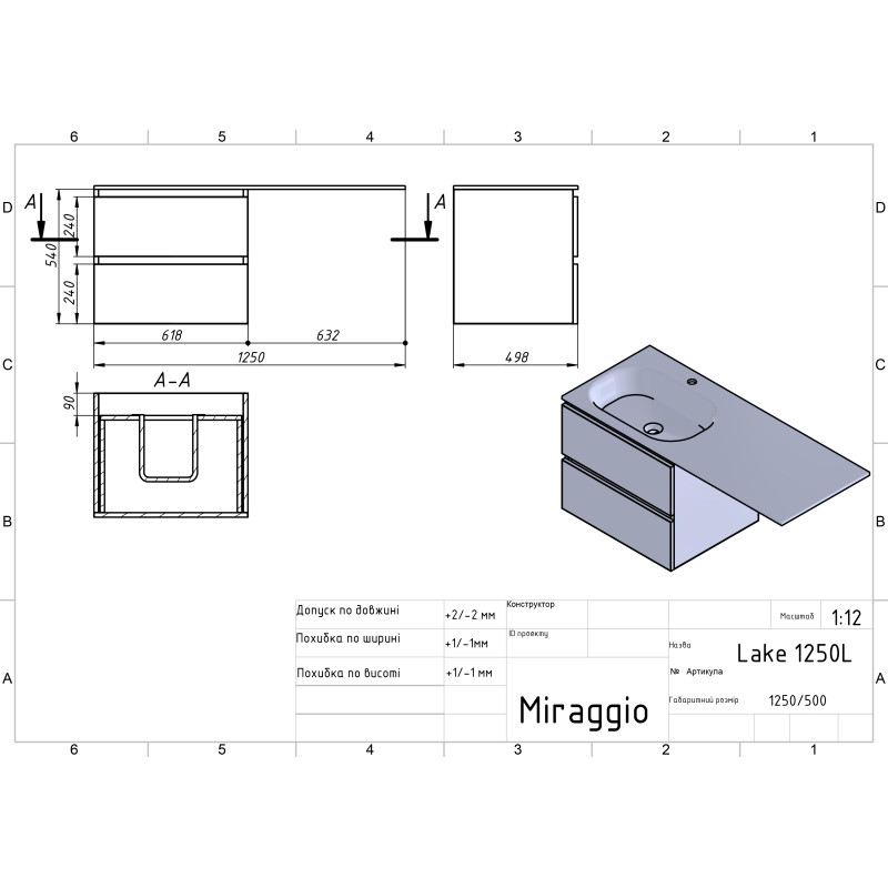 | Раковина в комплекті | LAKE 1250 L |