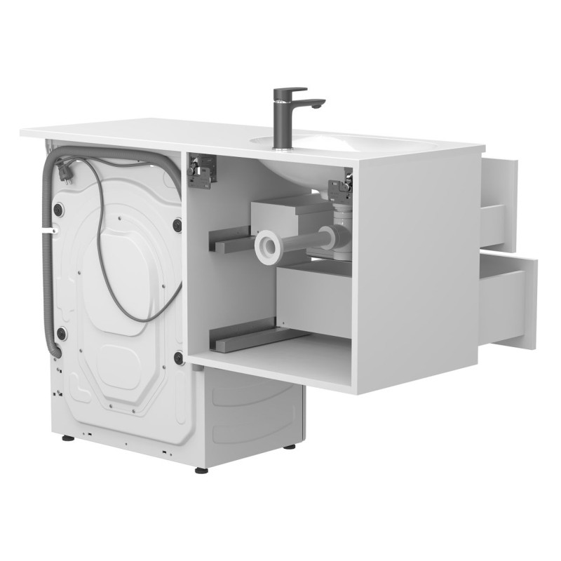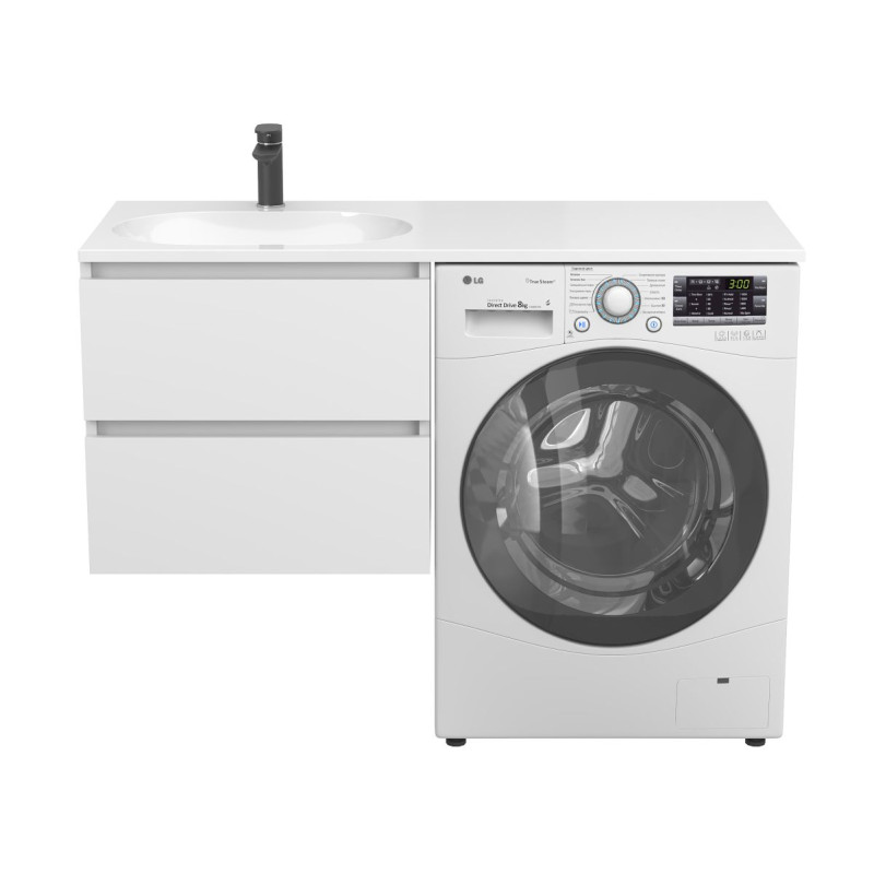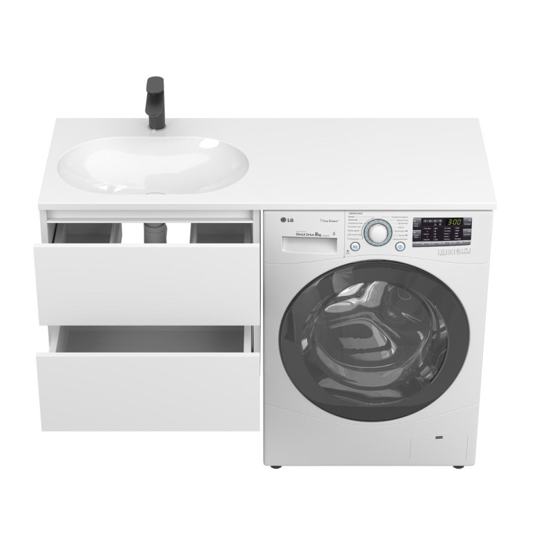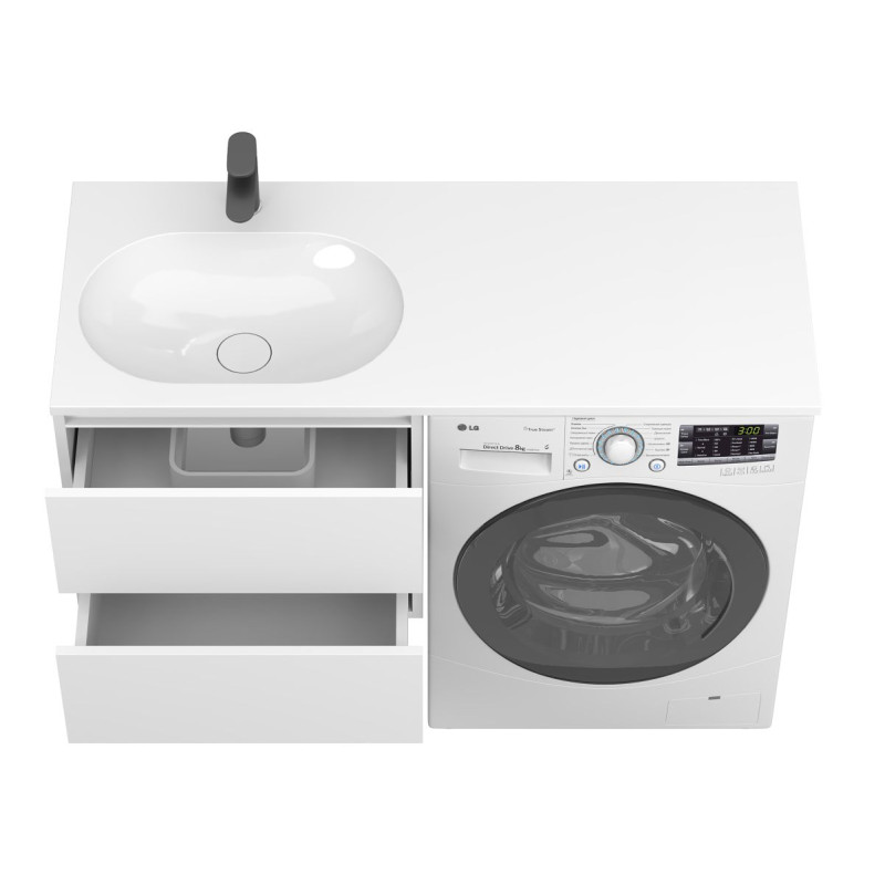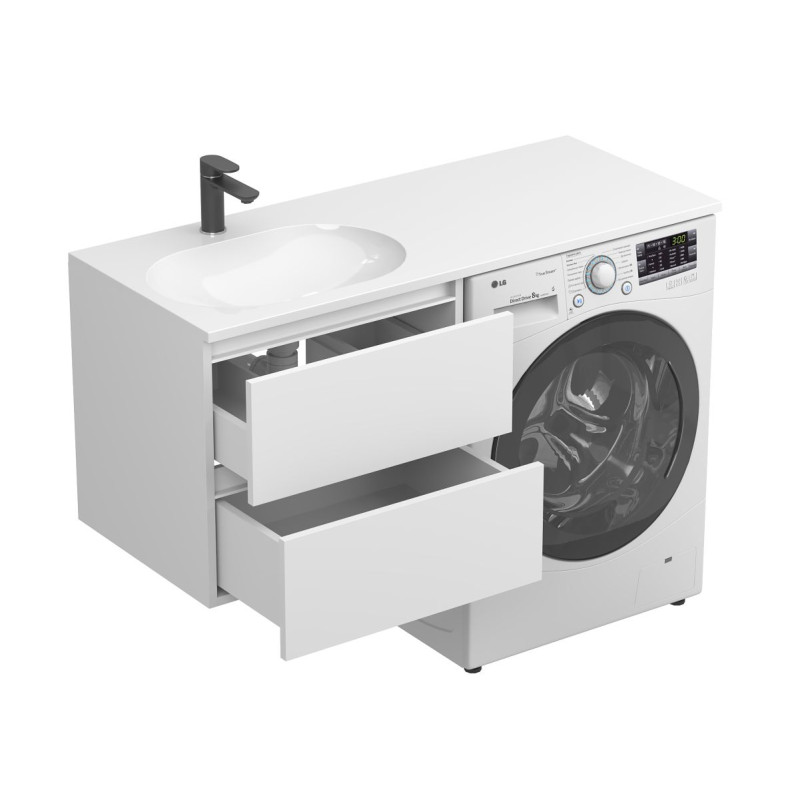 Тумба підвісна LUMO Біла матова з умивальником LAKE 1250 L від бренду MIRAGGIO — практичне та стильне рішення для ванної кімнати дому, готелю чи апартаментів.