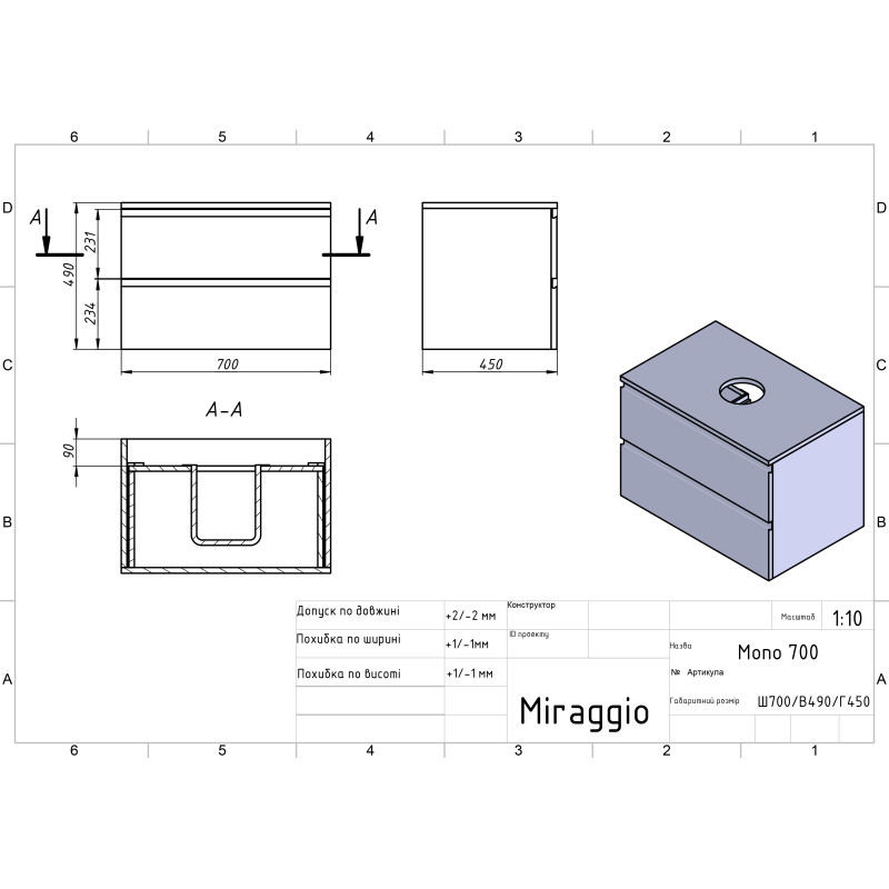 Ширина виробу — 700 мм робить модель зручною для приміщень різної площі. Спосіб відчинення шухляд у даній моделі тумби - За фасад.