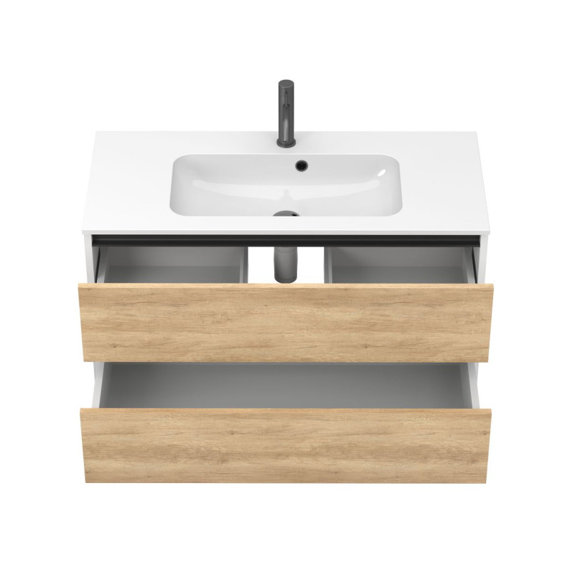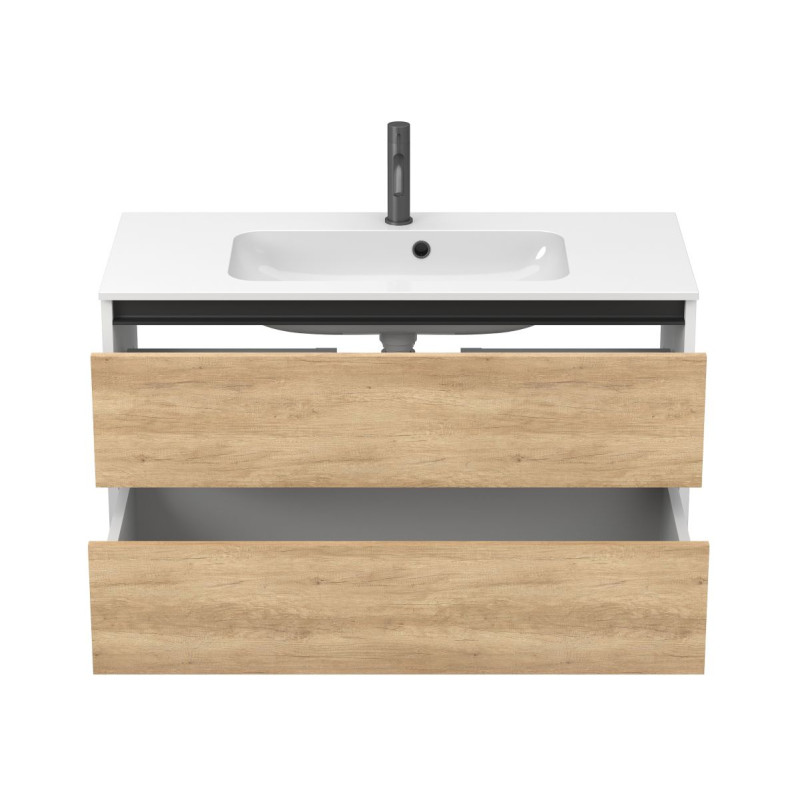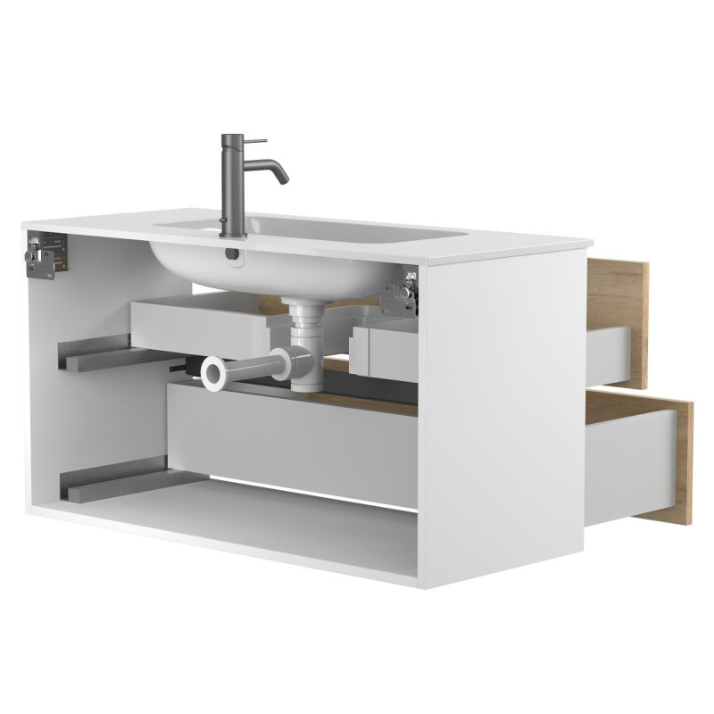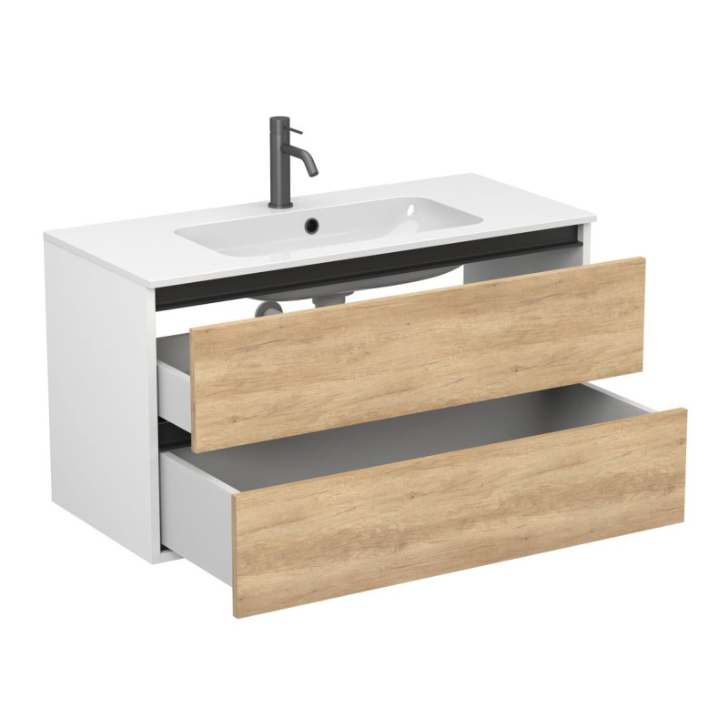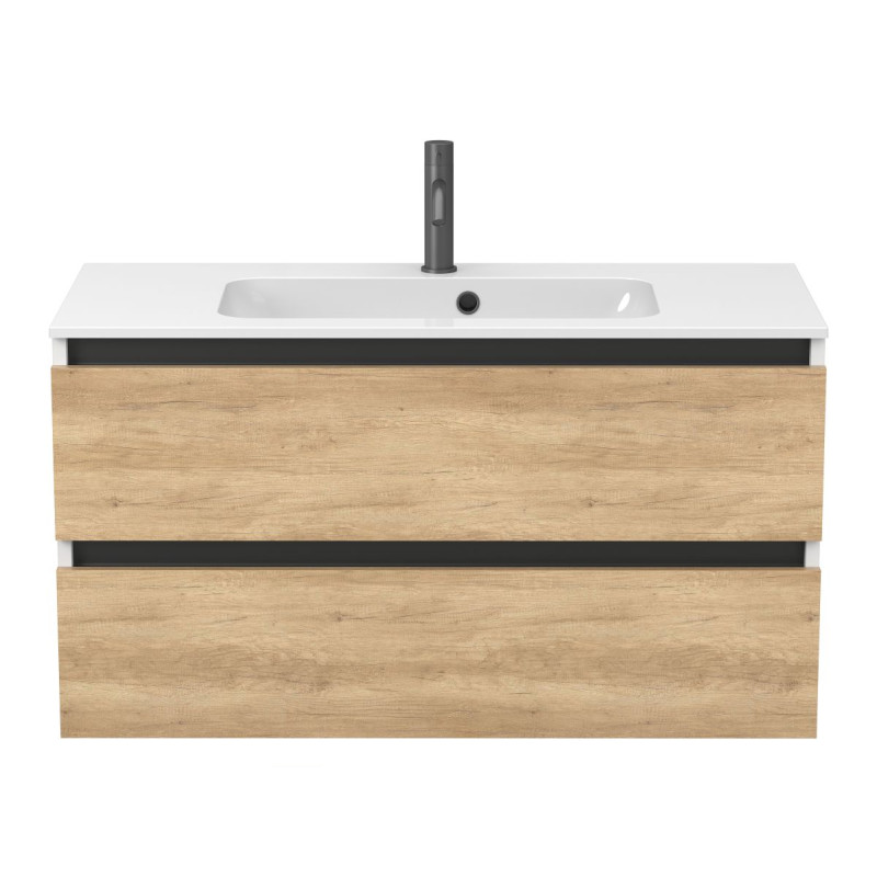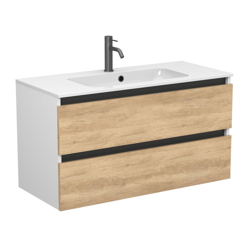 Тумба підвісна NATURA Дуб Небраска з умивальником DELLA 1000 від бренду MIRAGGIO — практичне та стильне рішення для ванної кімнати дому, готелю чи апартаментів.