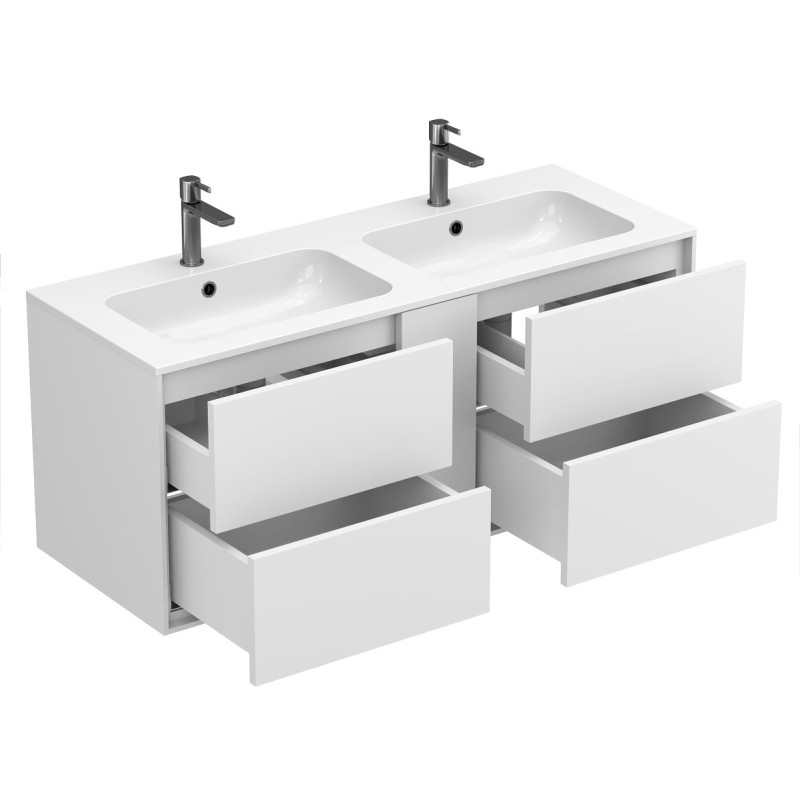 Тумба підвісна SPACE Біла soft-touch з умивальником DELLA 1200 D від бренду MIRAGGIO — практичне та стильне рішення для ванної кімнати дому, готелю чи апартаментів.