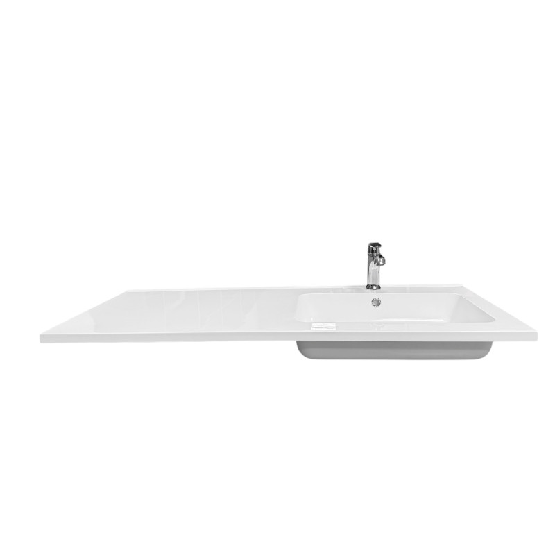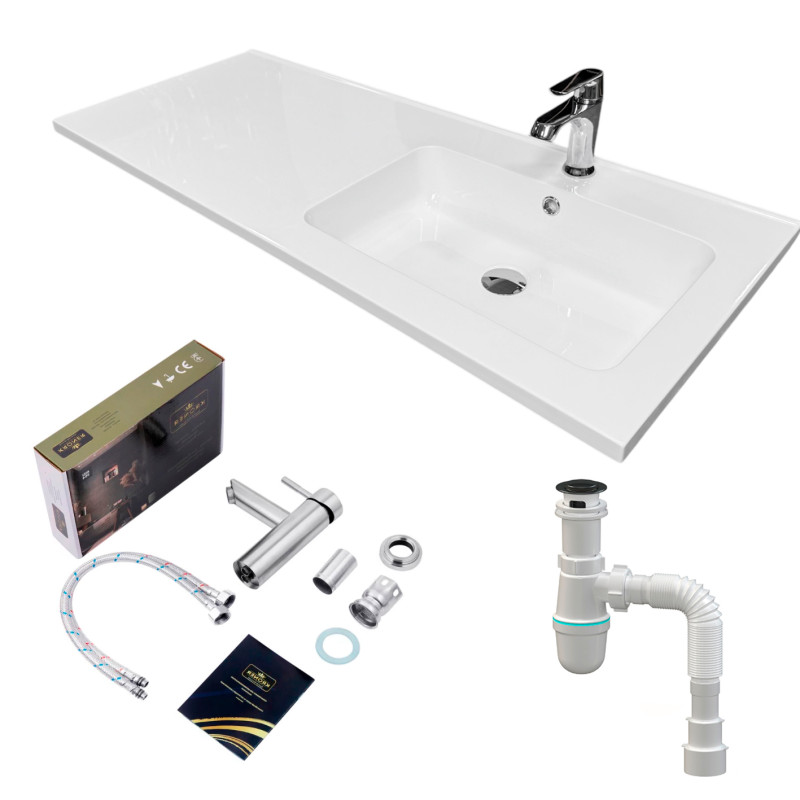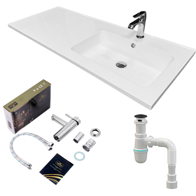 Набір для ванної кімнати Adamant FLATE 120R включає раковину зі штучного каменю, змішувач та сифон Click-Clack. Раковина прямокутної форми з чашею праворуч та крилом ліворуч має розміри 119,8 х 47,8 х 14 см, білий колір та отвір для переливу. Одноважільний змішувач оснащено аератором, металевим важелем та стаціонарним виливом з хромовим покриттям. Пластиковий сифон забезпечує мокрий гідрозатвор, автоматичне відкриття зливу та функцію переливу.