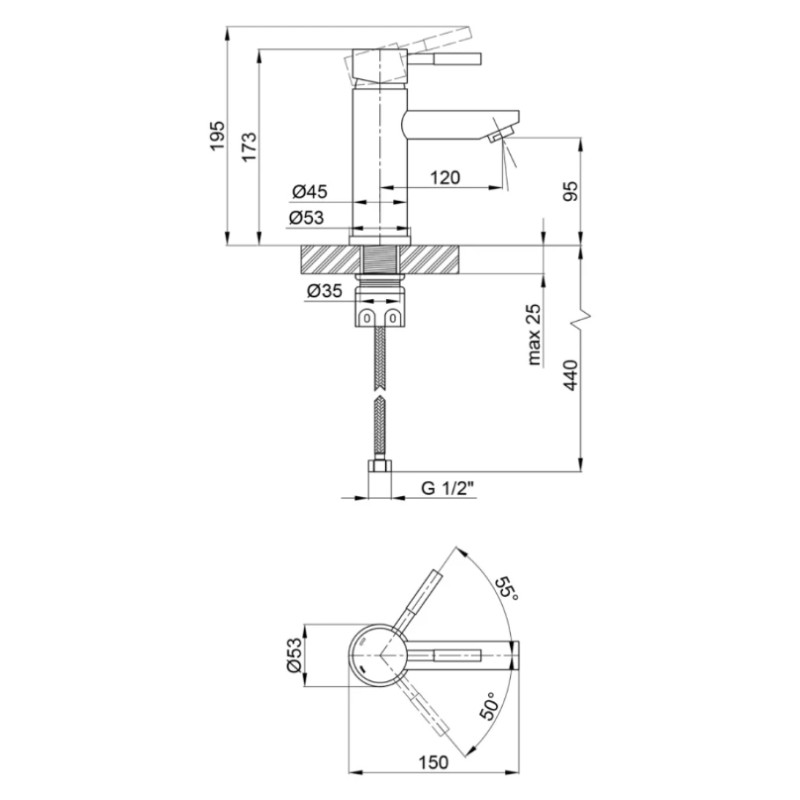 | Висота | 17.3 см /(з важелем у нижньому положенні), 19.3 см (з важелем у верхньому положенні) |