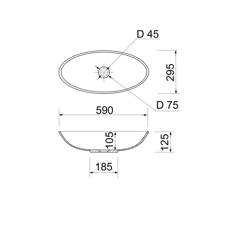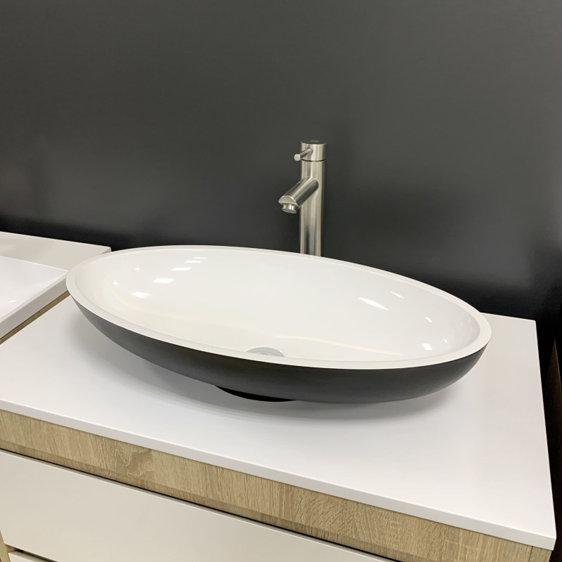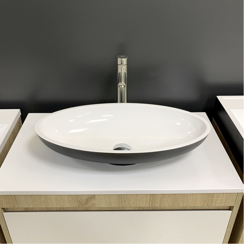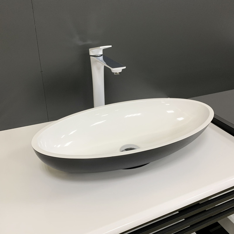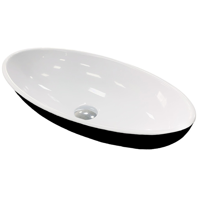 Раковина Adamant ANDERE NEW має овальну форму, виготовлена зі штучного каменю з розмірами 590 x 295 x 130 мм та чорно-білим кольором. Накладний тип встановлення без отвору для змішувача та переливу дозволяє гнучкий монтаж на стільницю чи тумбу. Матеріал складається з 80% литого каменю та 20% сантехнічної штучної кераміки, стінки товщиною до 20 мм. Поверхня гладка, стійка до барвників та хімічних речовин, витримує температуру до +165°C.
