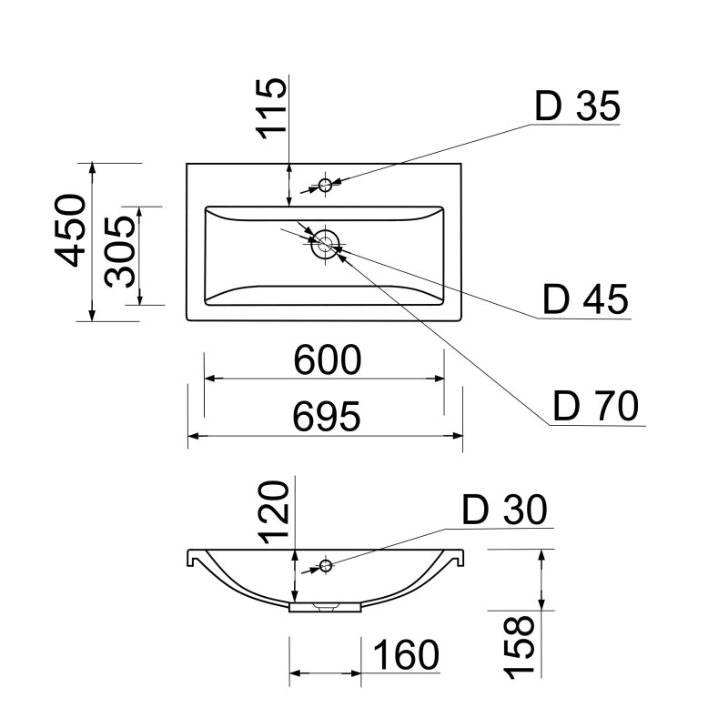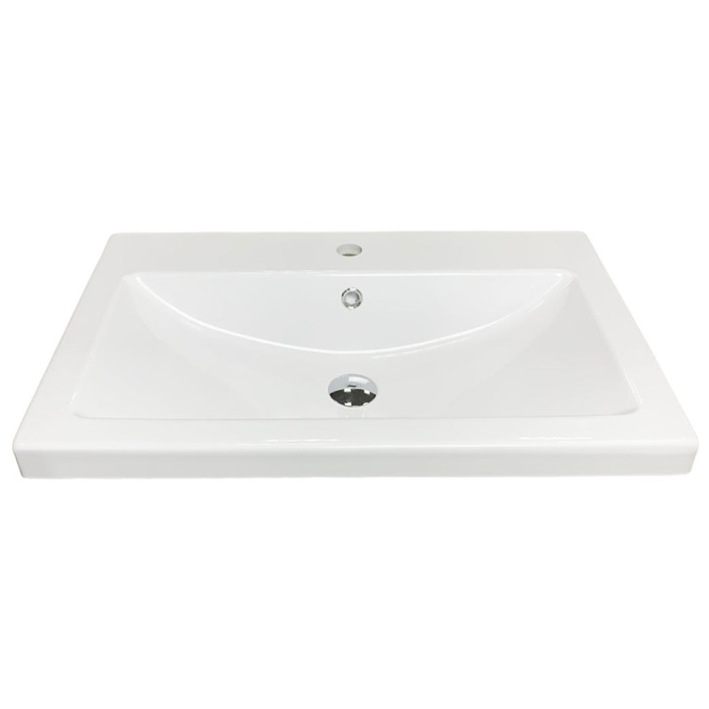 Раковина Adamant CERS має прямокутну форму, виготовлена зі штучного каменю з розмірами 695 x 450 x 158 мм та білим кольором. Накладний тип встановлення з отворами для змішувача та переливу дозволяє монтаж на тумбу. Матеріал створений за технологією Solid Surface, стійкий до впливу та довговічний.