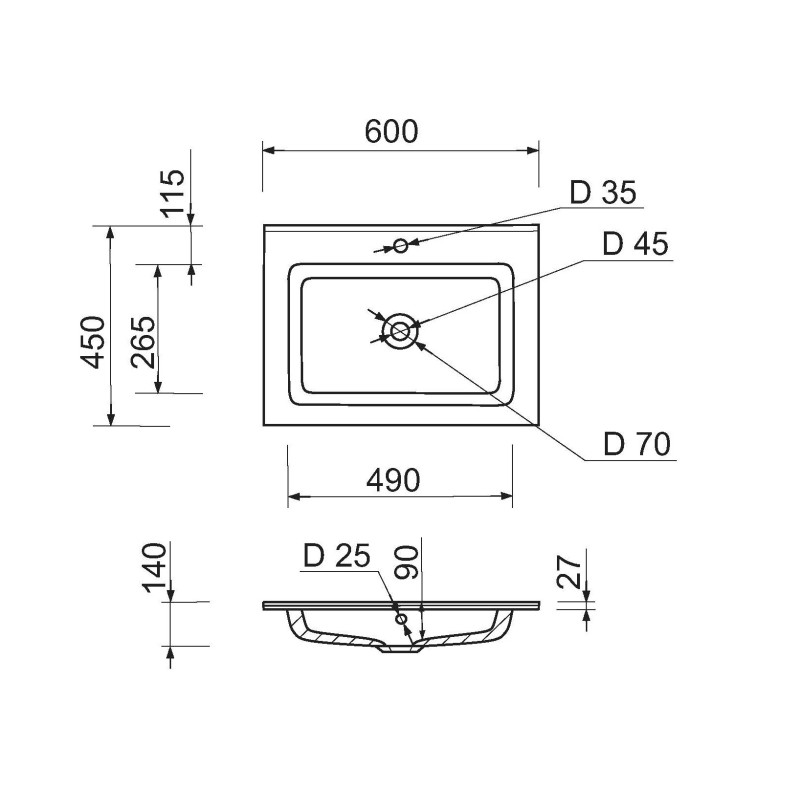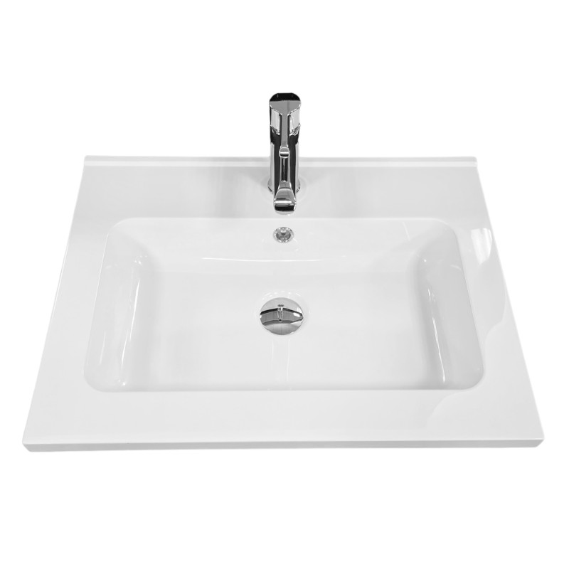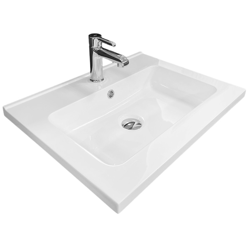 Раковина Adamant FLAT має прямокутну форму, виготовлена зі штучного каменю з розмірами 600 x 450 x 140 мм та білим кольором. Накладний тип встановлення з отворами для змішувача та переливу дозволяє монтаж на тумбу. Матеріал створений за технологією Solid Surface, стійкий до впливу та довговічний.