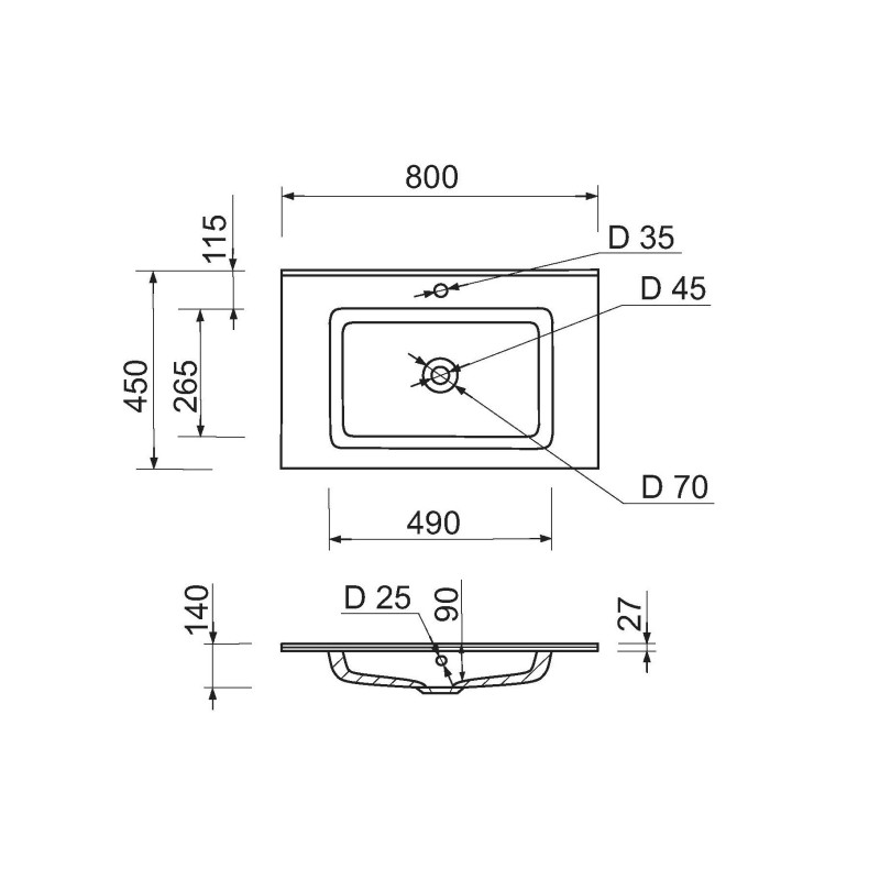 Раковина Adamant FLAT має прямокутну форму, виготовлена зі штучного каменю з розмірами 800 x 450 x 140 мм та білим кольором. Накладний тип встановлення з отворами для змішувача та переливу дозволяє монтаж на тумбу. Матеріал створений за технологією Solid Surface, стійкий до впливу та довговічний.