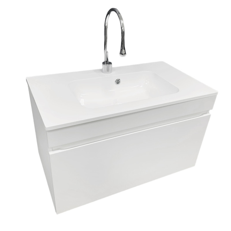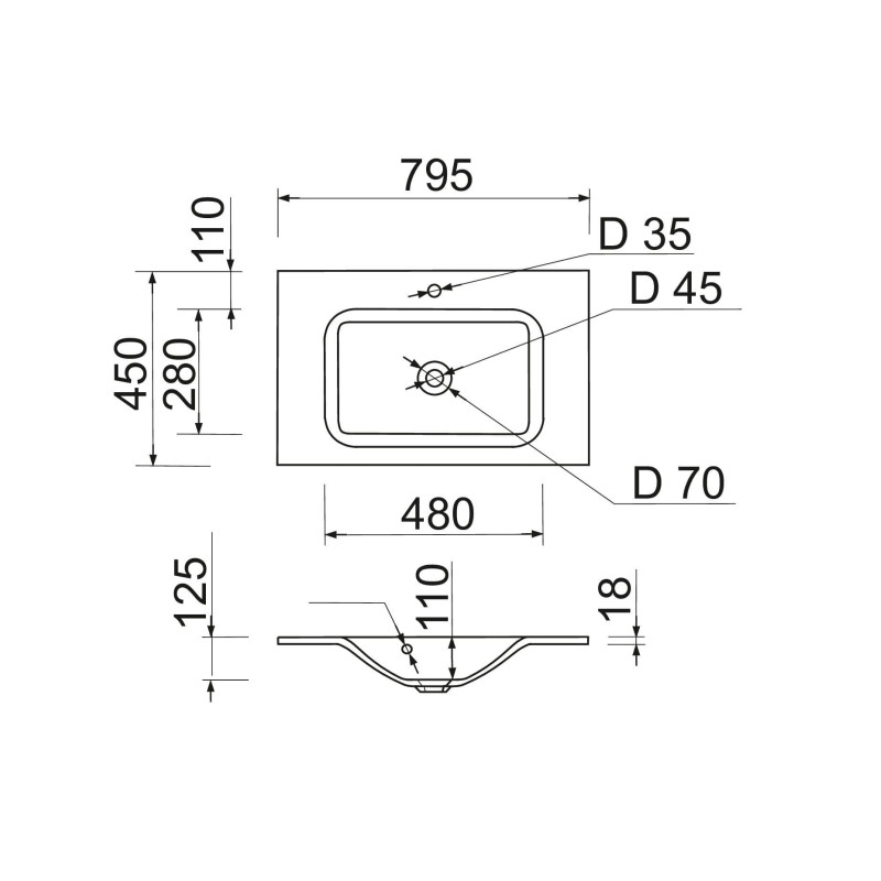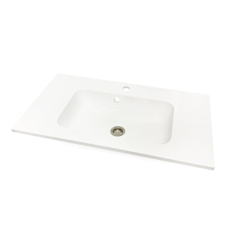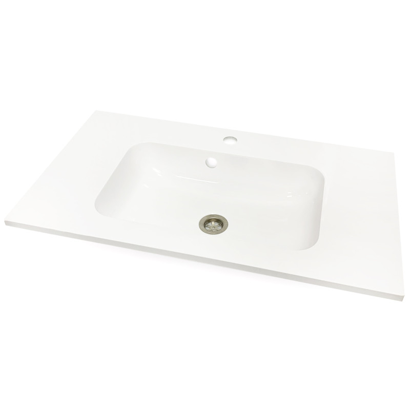 Раковина Adamant FRATE має прямокутну форму, виготовлена зі штучного каменю з розмірами 795 x 450 x 125 мм та білим кольором. Накладний тип встановлення з отворами для змішувача та переливу дозволяє монтаж на тумбу. Матеріал створений за технологією Solid Surface, стійкий до впливу та довговічний.