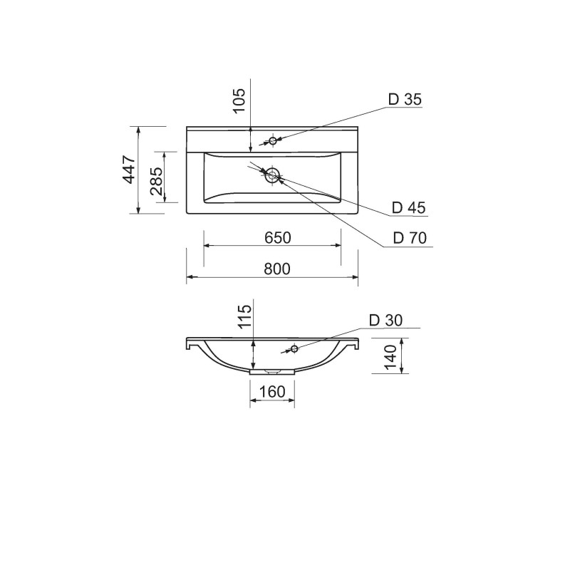 Раковина Adamant QUANTO має прямокутну форму, виготовлена зі штучного каменю з розмірами 800 x 447 x 140 мм та білим кольором. Накладний тип встановлення з отворами для змішувача та переливу дозволяє монтаж на поверхню. Матеріал створений за технологією Solid Surface, стійкий до впливу та довговічний.