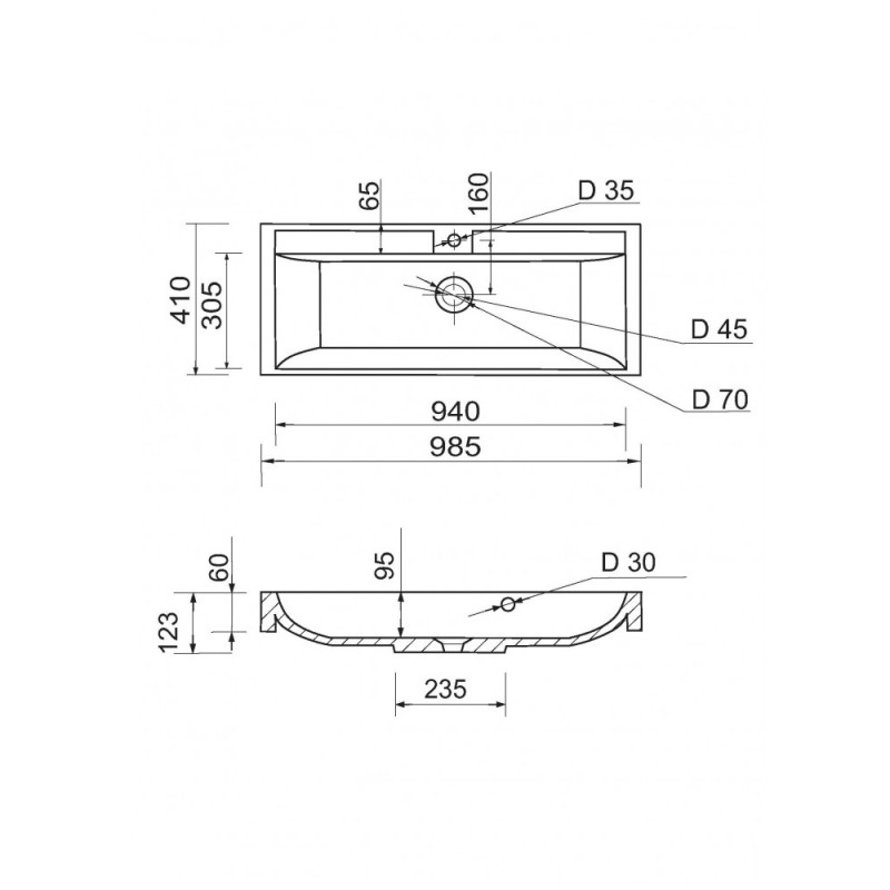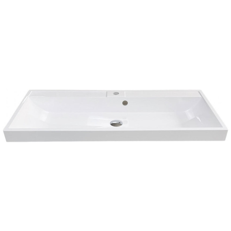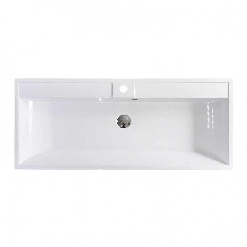 Раковина Adamant STRENG NEW має прямокутну форму, виготовлена зі штучного каменю з розмірами 990 x 410 x 123 мм та білим кольором. Накладний тип встановлення з отворами для змішувача та переливу дозволяє монтаж на тумбу. Матеріал створений за технологією Solid Surface, стійкий до впливу та довговічний.