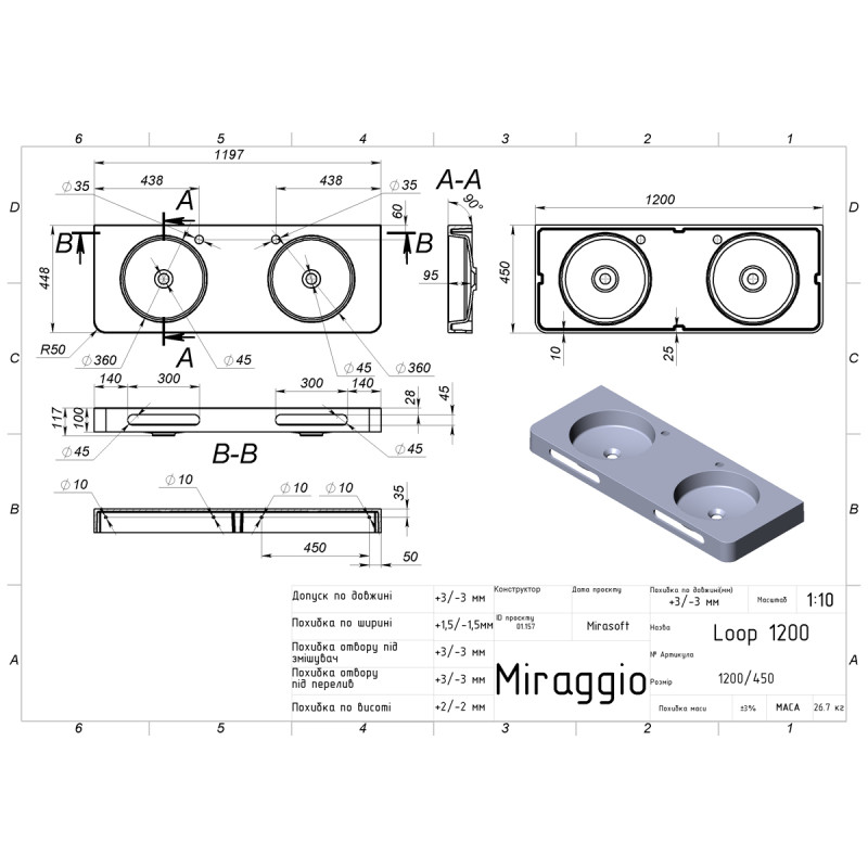 | Назва | Умивальник підвісний MIRAGGIO LOOP double 11,7*119,7*44,8 Mirasoft Білий 8814003 |