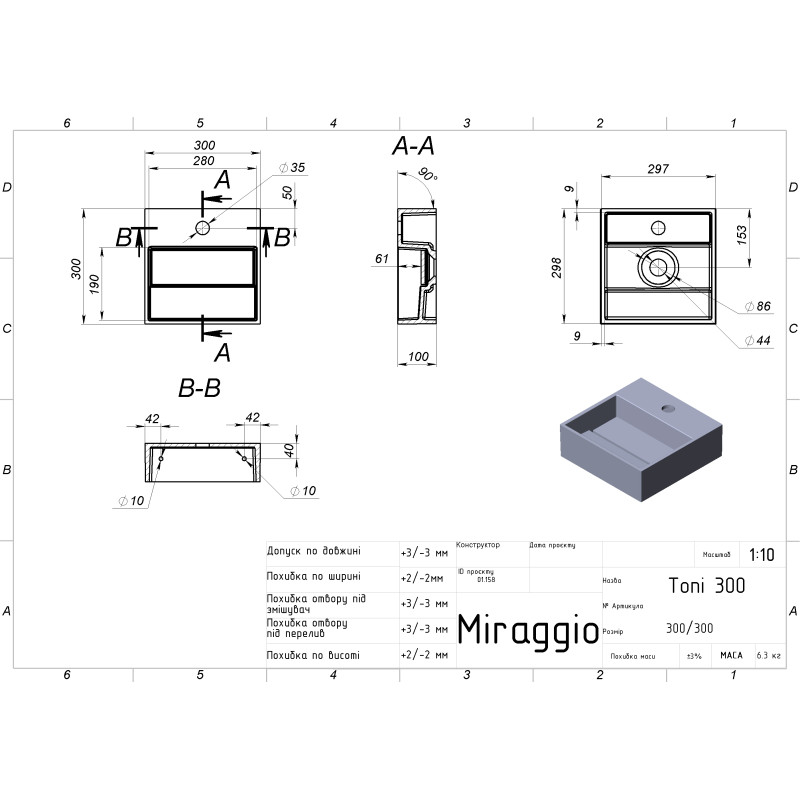Умивальник TONI 300 від бренду MIRAGGIO - це ідеальне рішення для санвузла дому, готелю чи дачі.