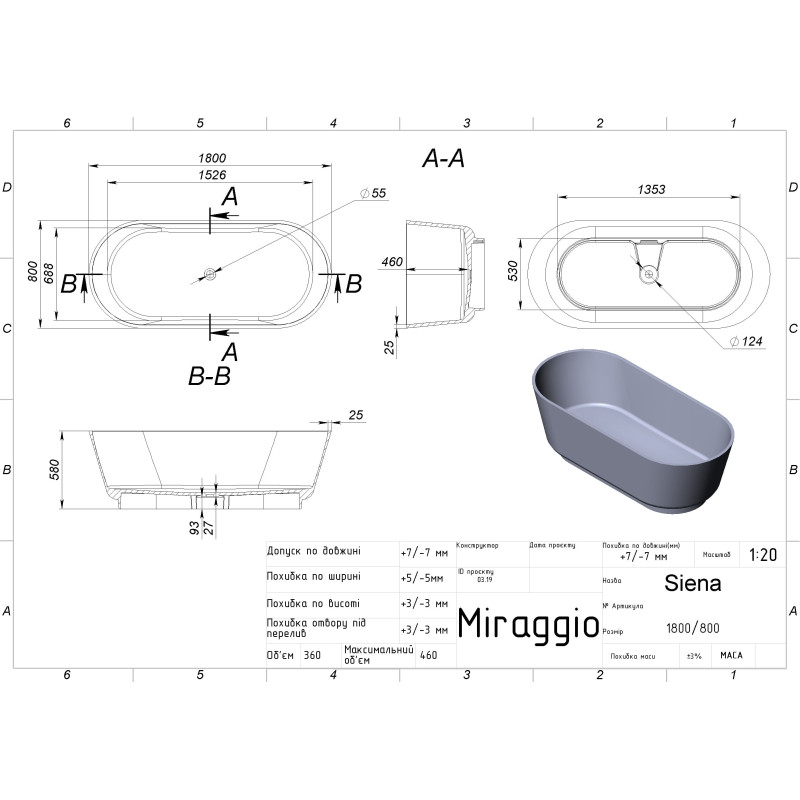 Ванна зі штучного каменю MIRAGGIO - ідеальний варіант доповнення сучасного інтер'єру ванної кімнати. Овальна;Чаша ванна SIENA з матеріалу Miramarble Matt - це досконале творіння за дизайном та функціональністю. Поверхня ванни - матова. Тип встановлення ванни - окремостояча.