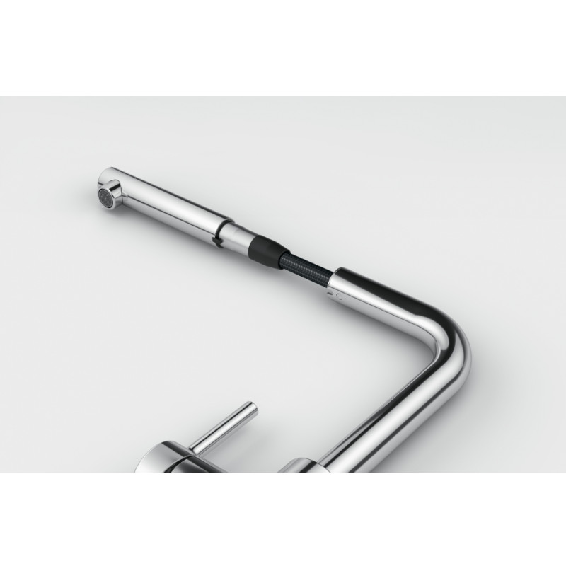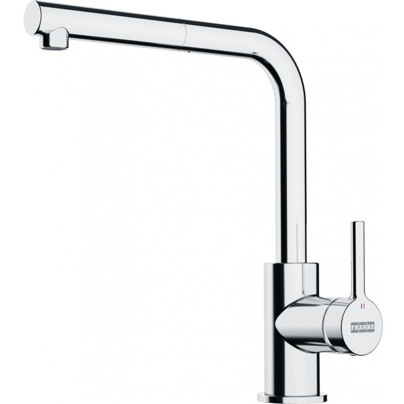 Franke Lina L Pull Out — стильний змішувач хромового кольору з витяжним шлангом, висотою 285 мм та L‑виливом довжиною 254 мм. Поворот 360°, монокомандне керування і міцна латунна конструкція. Ідеально пасує до сучасної кухні — дивовижна комбінація дизайну та функціональності