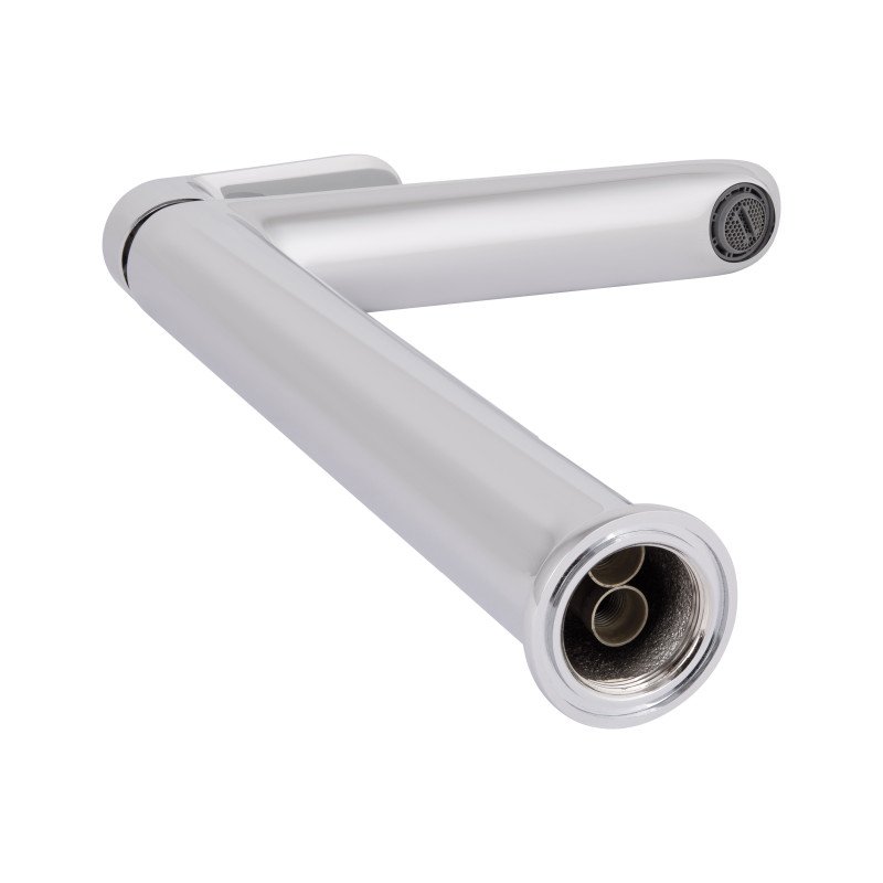 Високий змішувач для раковини Qtap Tern QTTER269CRM47585 — надійне рішення для встановлення з накладними раковинами. Корпус виготовлений із латуні з хромованим покриттям, що захищає його від корозії та механічних пошкоджень. Високий вилив забезпечує зручність у використанні, а вбудований аератор сприяє рівномірному та економному витрачанню води. Одноважільна система керування дозволяє легко регулювати температуру й напір. Змішувач монтується на один отвір, поєднуючи практичність і сучасний зовнішній вигляд.