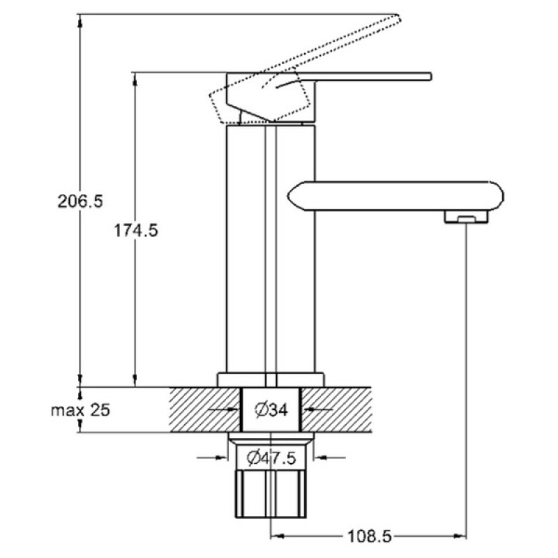 Змішувач G-Lauf NOB1-A128 використовується для умивальника, має неповоротний прямий вилив (гусак) 110мм, литий корпус, одновентильне управління, керамічний картридж діаметром 35мм і красивий сучасний дизайн.