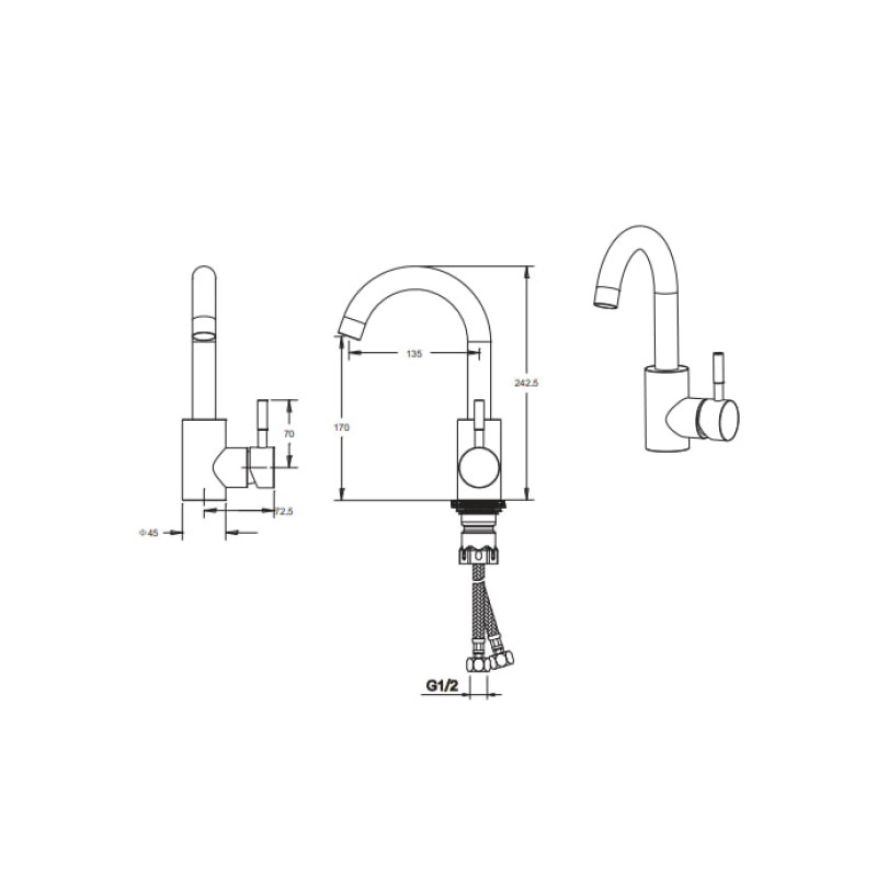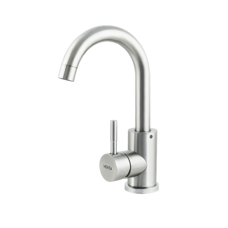 Змішувач для умивальника VENTA VS112US у класичному відтінку нержавіючої сталі створений для тих, хто шукає баланс між естетикою та довговічністю. Його U-подібний вилив довжиною 13,5 см забезпечує зручний потік води. Керування водою здійснюється за допомогою важеля, який активується легким потягом на себе. Завдяки компактному дизайну і лаконічним обрисам, цей змішувач легко інтегрується в ваш інтер'єр. Виготовлений із стійкої до зношування харчової нержавіючої сталі, він не боїться частого використання, перепадів температур і дії води з підвищеною жорсткістю.