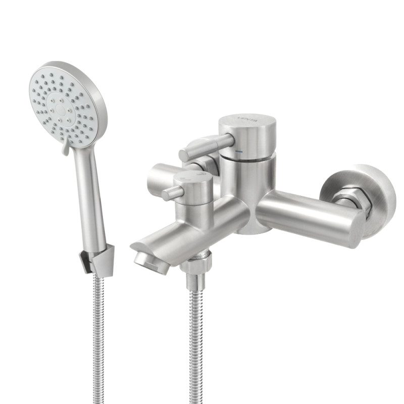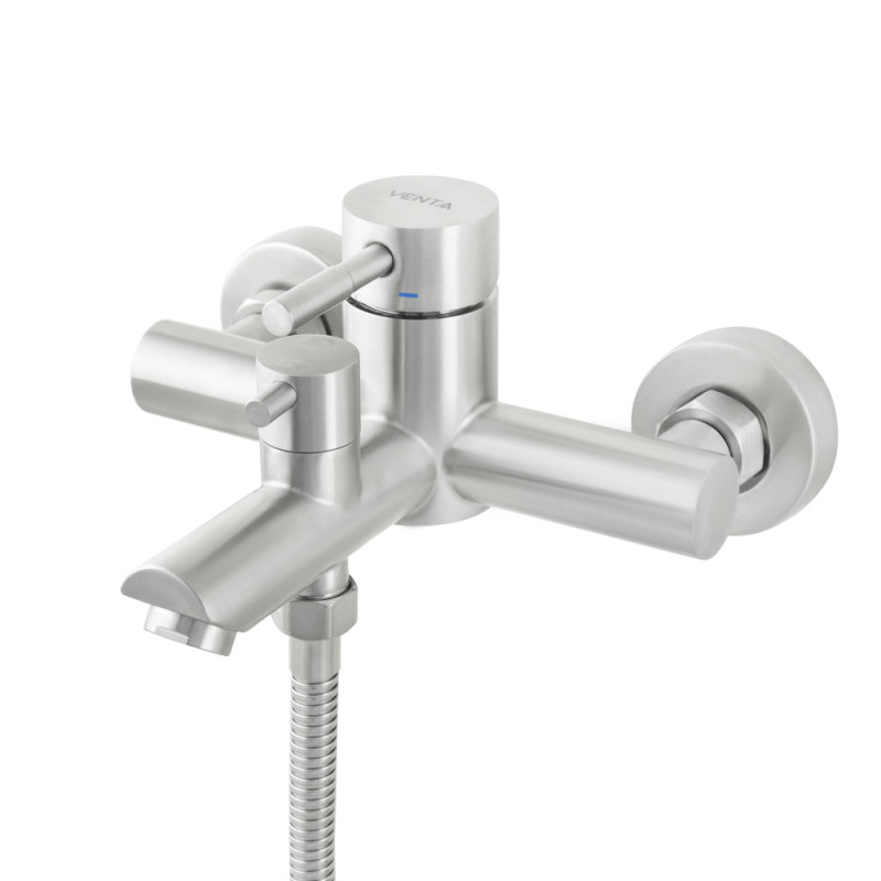 Змішувач для ванни VENTA VS333LS вирізняється елегантністю плавних форм і вишуканою простотою. Його короткий стаціонарний вилив довжиною 160 мм ідеально підходить для сучасного дизайну ванної кімнати, де важливе поєднання комфорту й стриманого стилю. Усі елементи корпусу — із нержавіючої сталі — витримують вологу й температуру без втрати блиску. Одноважільна система, встановлена на литому цинковому сплаві, дає змогу легко керувати температурою та напором води. Корпус кріпиться до стіни за допомогою гайкового з'єднання, а декоративні накладки приховують всі монтажні вузли, зберігаючи чистоту ліній.