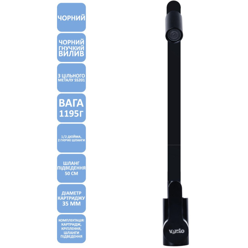 | Особливості | гнучкий вилив, підвід води- 1 / 2 дюйма, 2 гнучкі шланги 50см |