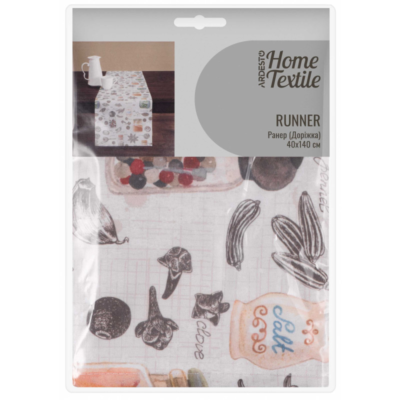 Ранер є текстильним виробом, який виконує естетичну та практичну функції, захищаючи поверхню від забруднення та надаючи оригінальності сервіруванню. Матеріали виготовлення виробу поліестер (90 %) і бавовна (10 %) забезпечать тривалий термін слугування. Ранер розміром 40 × 140 см у дизайні Spice матиме ефектний вигляд на будь-якій сучасній кухні. Для збереження м’якості та кольору тканини догляду необхідно дотримуватися таких вимог: прати в пральній машині за 30 °C на делікатному режимі; сушити в машині за низької температури; не відбілювати; не чистити будь-яким розчинником, крім трихлоретилену; прасувати за температури до 110 °C.