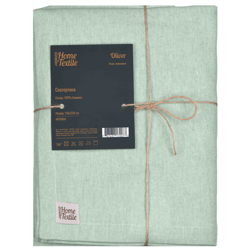Стильна скатертина Oliver вдало доповнить інтер’єр їдальні чи кухні. Вироблена зі 100 % бавовни, вона вирізняється зносостійкістю та легкістю щодо догляду, проте для збереження первинного вигляду все ж варто зважати на рекомендації: прати в машині за делікатного режиму (30 °C); не сушити в сушильній машині, а тільки у вертикальному положенні; прасувати за температури до 150 °C; також заборонено відбілювання та хімчистка. Завдяки розміру 136 × 220 см скатертина згодиться для великих столів, а з огляду на яскравий колір (аквамарин) вона допоможе додати яскравий акцент сервіруванню.