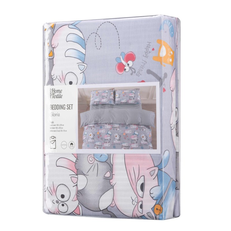 Комплект постільної білизни Gloria – це поєднання витонченого дизайну й безкомпромісної якості. Вироблена зі 100 % бавовняного сатину щільністю 200 ТС, постіль подарує винятковий комфорт і затишок. М’яка тканина ніжно пестить шкіру, забезпечуючи її дихання і створюючи відчуття свіжості та легкості. Яскравий дизайн із милим принтом і смужками на звороті підковдри додає спальному місцю особливого шарму.