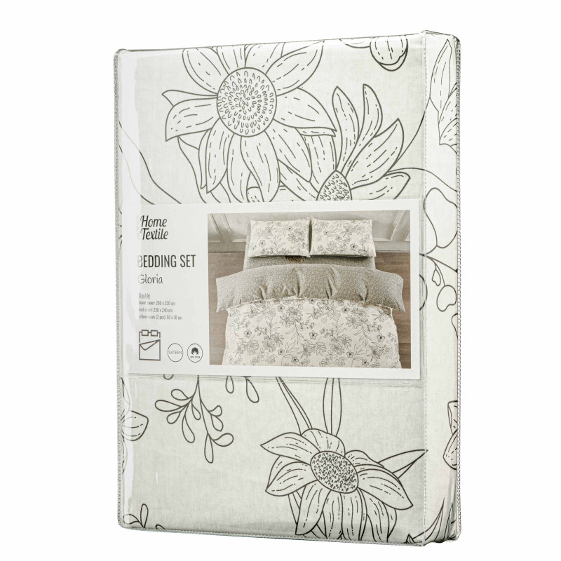 Комплект постільної білизни Gloria – це поєднання витонченого дизайну й безкомпромісної якості. Вироблена зі 100 % бавовняного сатину щільністю 200 ТС, постіль подарує винятковий комфорт і затишок. М’яка тканина ніжно пестить шкіру, забезпечуючи її дихання і створюючи відчуття свіжості та легкості. Розкішний дизайн із квітковими мотивами додає спальному місцю елегантності та спокою.