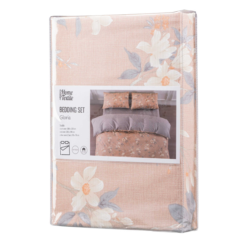 Комплект постільної білизни Gloria – це поєднання витонченого дизайну й безкомпромісної якості. Вироблена зі 100 % бавовняного сатину щільністю 200 ТС, постіль подарує винятковий комфорт і затишок. М’яка тканина ніжно пестить шкіру, забезпечуючи її дихання і створюючи відчуття свіжості та легкості. Розкішний дизайн із квітковими мотивами додає спальному місцю елегантності та спокою.