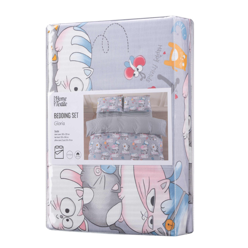 Комплект постільної білизни Gloria – це поєднання витонченого дизайну й безкомпромісної якості. Вироблена зі 100 % бавовняного сатину щільністю 200 ТС, постіль подарує винятковий комфорт і затишок. М’яка тканина ніжно пестить шкіру, забезпечуючи її дихання і створюючи відчуття свіжості та легкості. Яскравий дизайн із милим принтом і смужками на звороті підковдри додає спальному місцю особливого шарму.